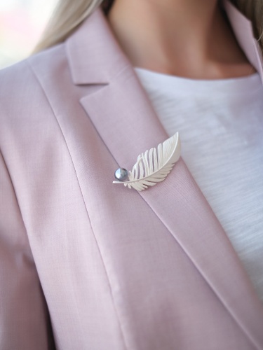 Изящная брошь в виде перышка с контрастным искусственным жемчугом. Добавит образу женственность и невесомость.