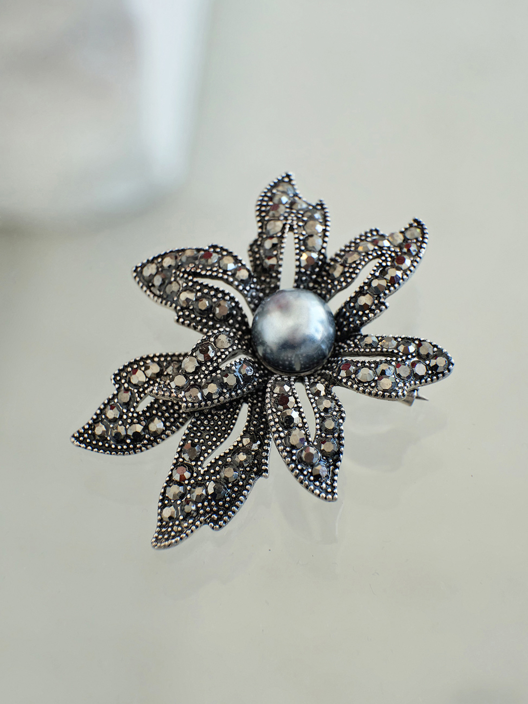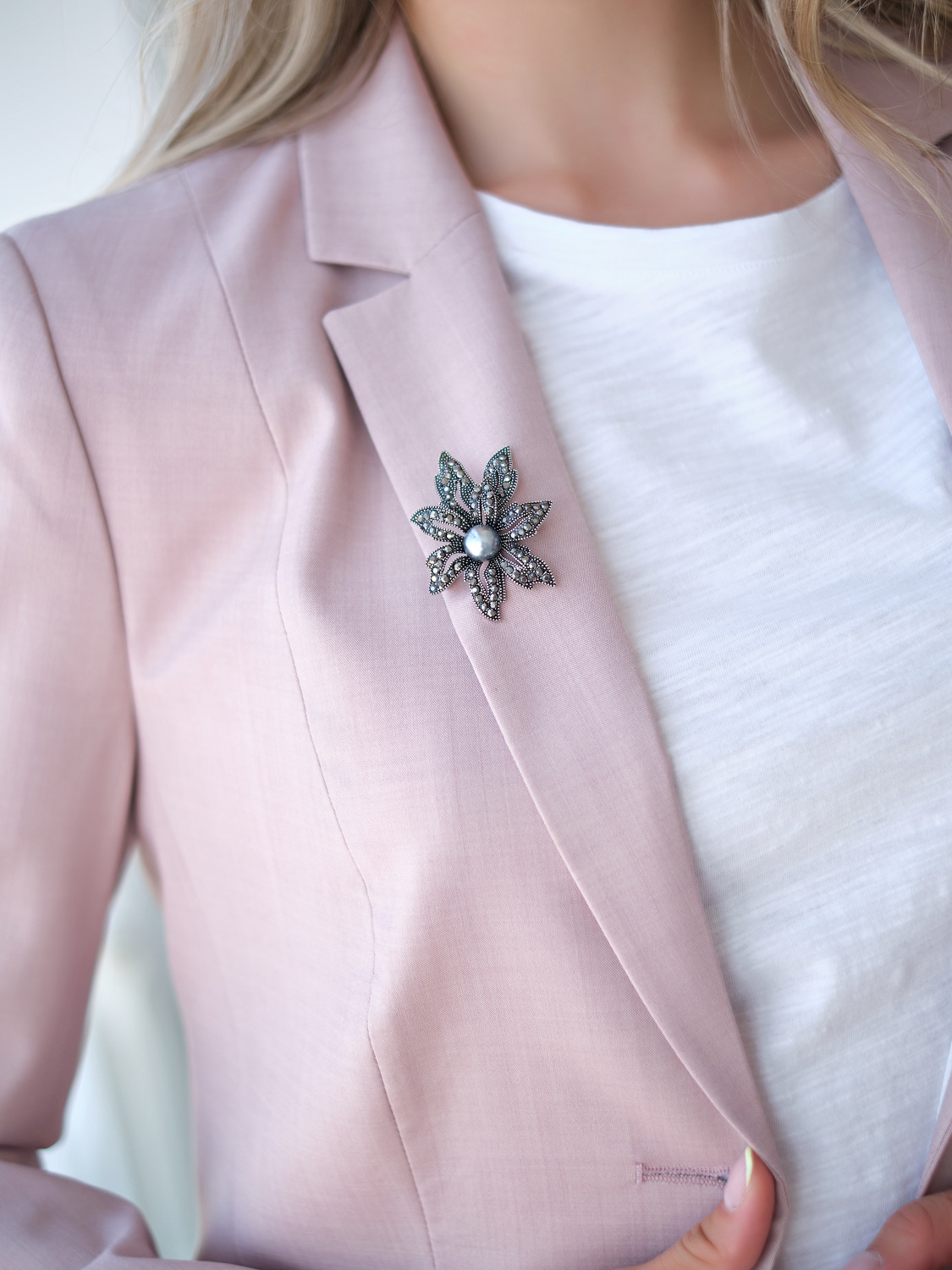 Женственная брошь в виде цветка с сердцевиной из искусственного жемчуга.