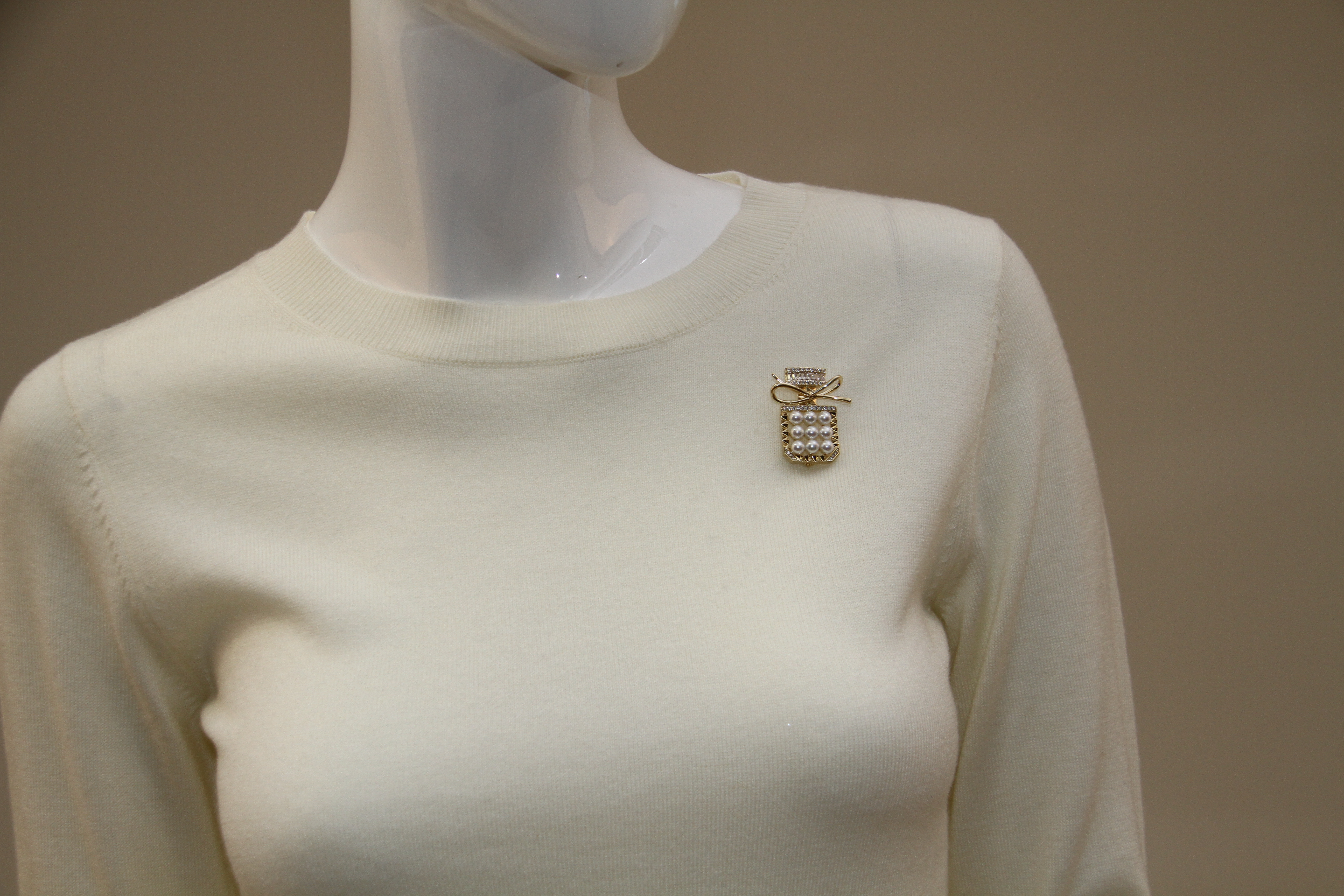 Оригинальная брошь в виде флакона с бантиком. Выполнена с использованием искуственного жемчуга.
