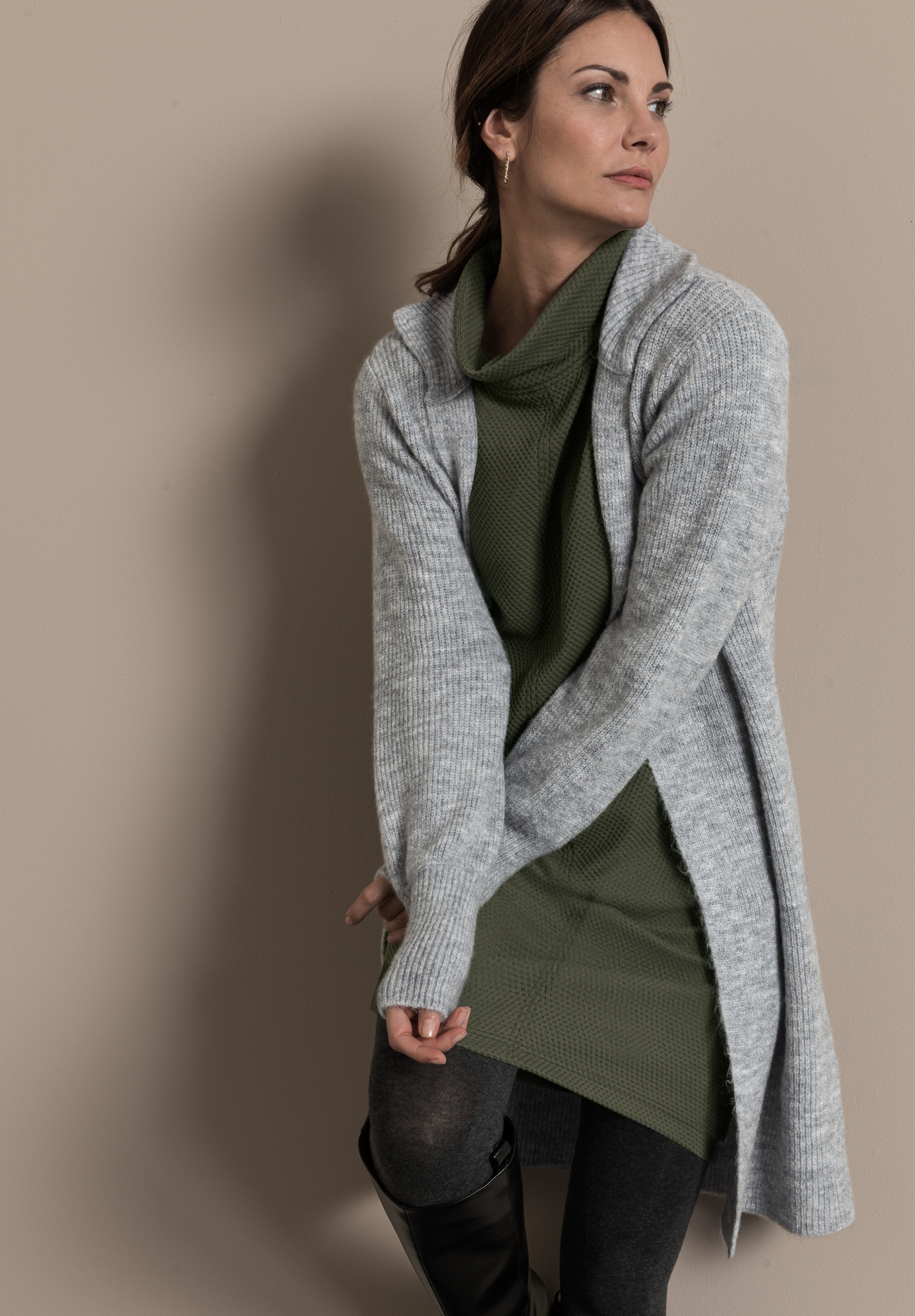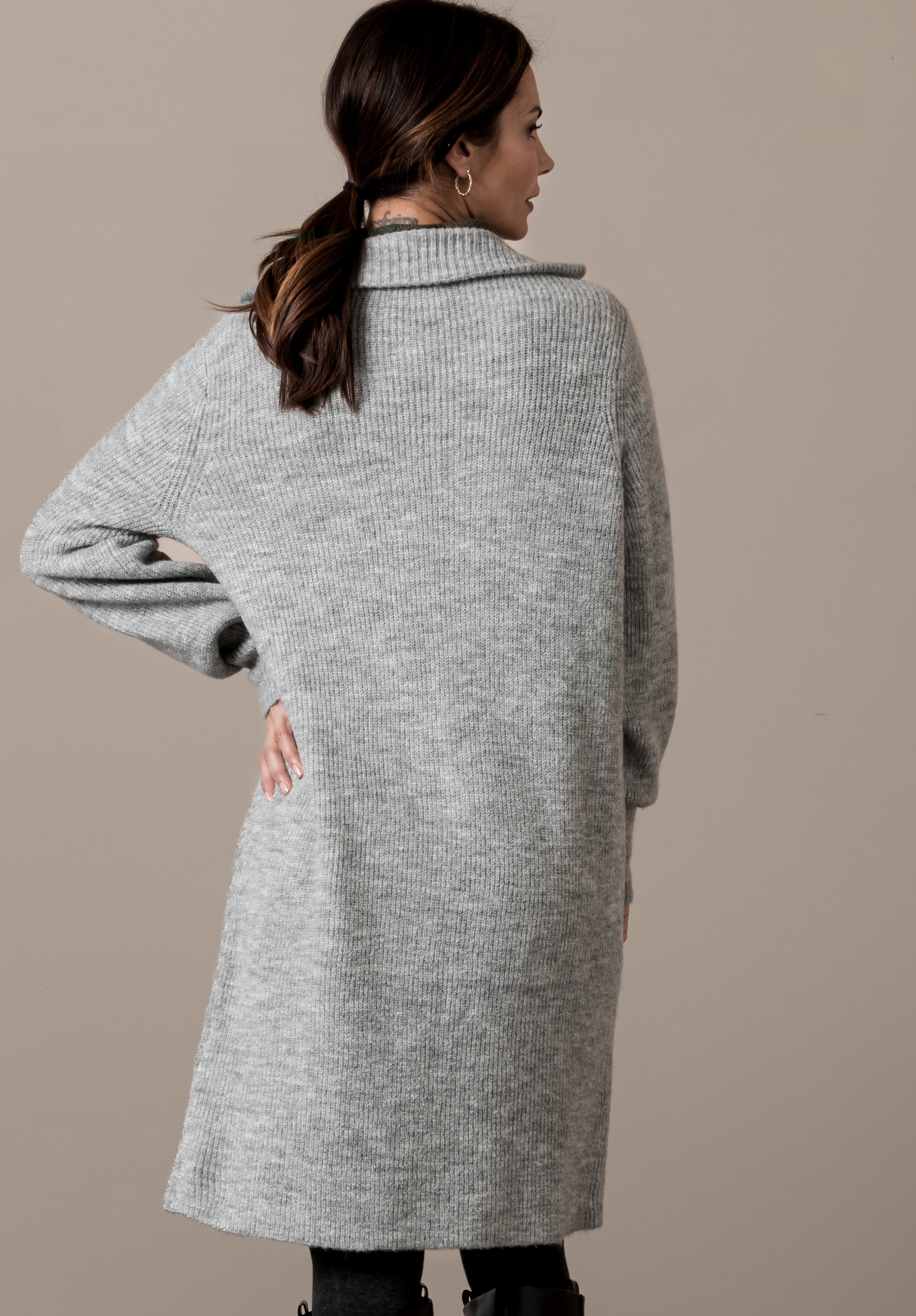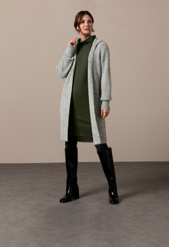 На сайте указаны российские размеры. Длинный кардиган, выполненный в модном стиле грубой вязки, не только очень приятный, но и стильный. Благодаря сочетанию мягкого материала с шерстью он кажется мягким и удобным в носке. Повседневный образ дополнен модным воротником-стойкой, широким низом рукавов и длинным свободным кроем. Длина в 44 размере около 88 см.