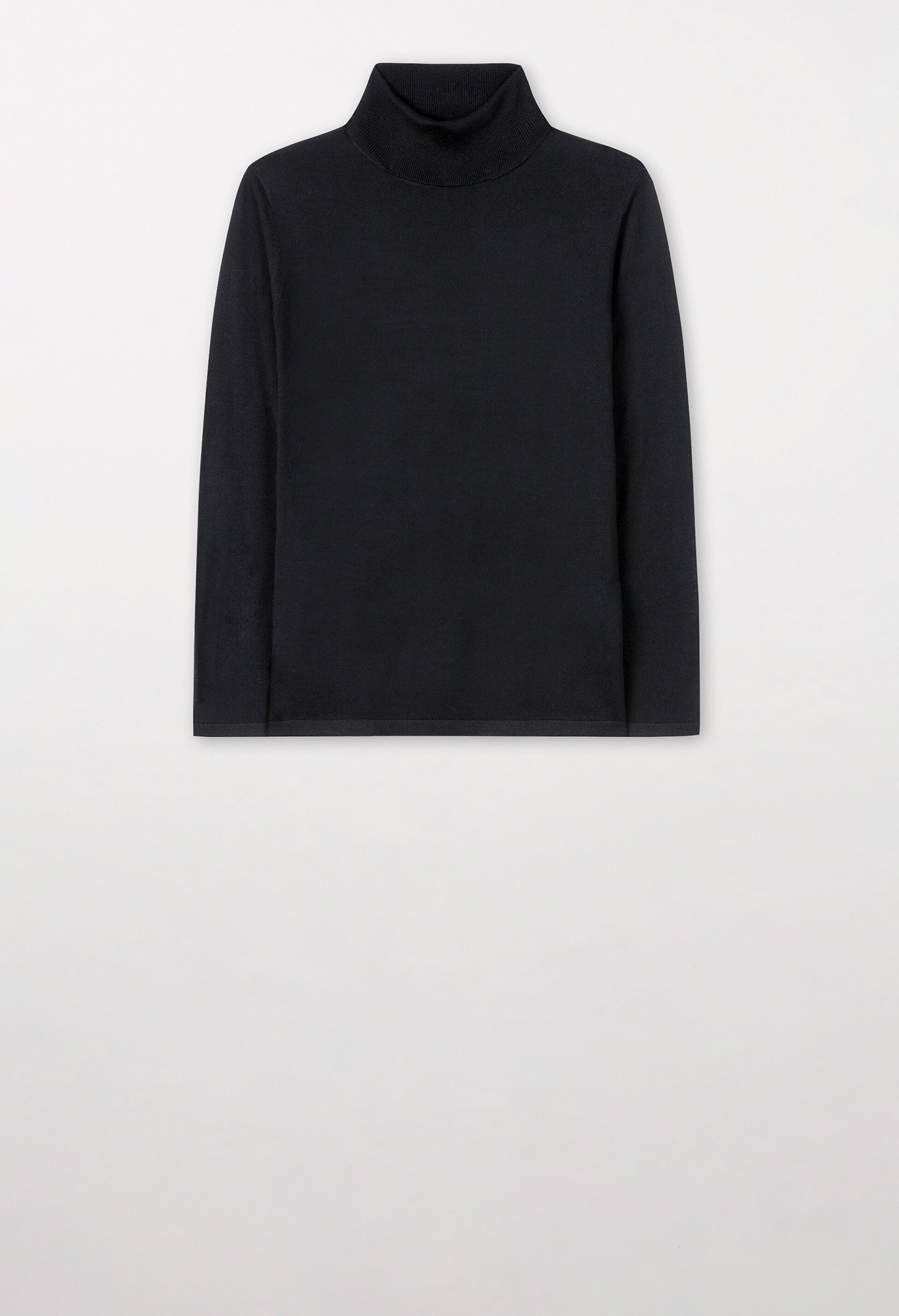 Пуловер с высоким воротником из изысканной ткани тонкой вязки с моделирующими деталями и ребристой отделкой. Содержание шелка в ткани обеспечивает ощущение особенной мягкости.