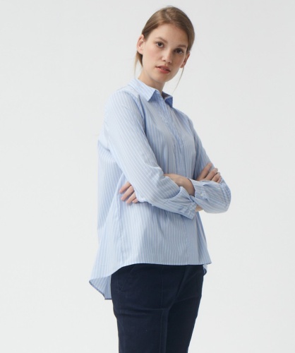 Повседневная оверсайз рубашка в широкую полоску. Втачной рукав полной длины с манжетой на пуговице. Рубашечный воротник, удлиненная спинка.
