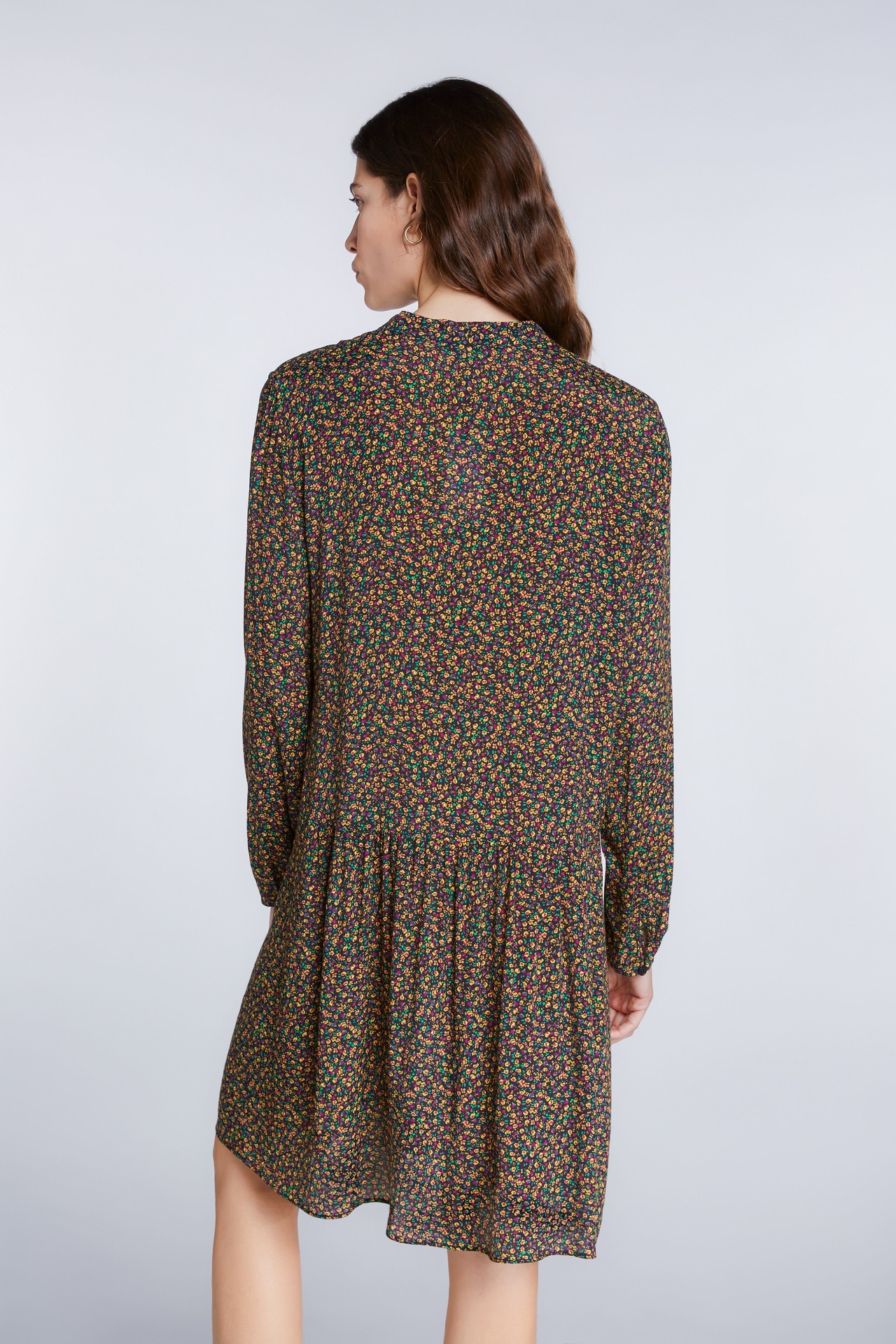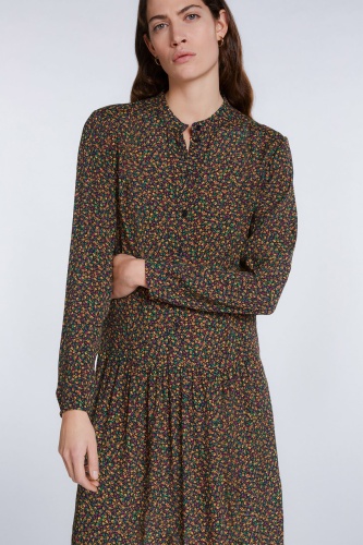 Романтичное платье свободного силуэта с заниженной талией. Длина до середины колена, втачной рукав полной дины, воротник стойка, планка с пуговицами. Можно составить великолепный трендовый образ с грубыми ботинками.