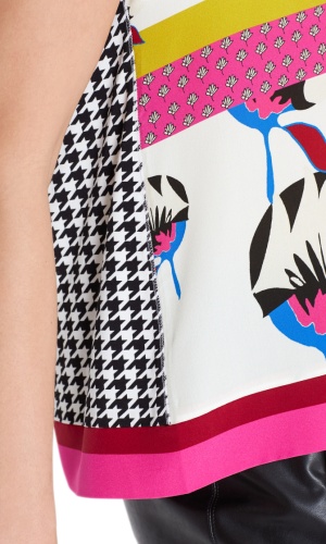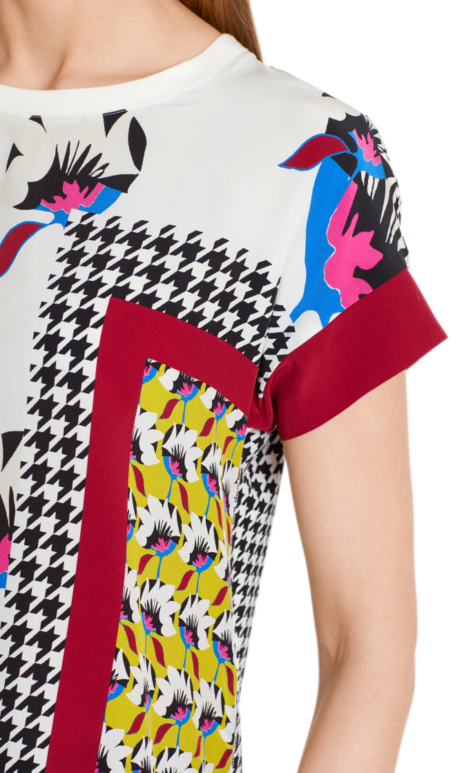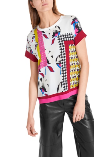 Блуза с ярким принтом станет главным акцентом в любом образе. Прямой покрой, круглый вырез горловины, короткие рукава. Приятный к телу материал из шелка и вискозы.