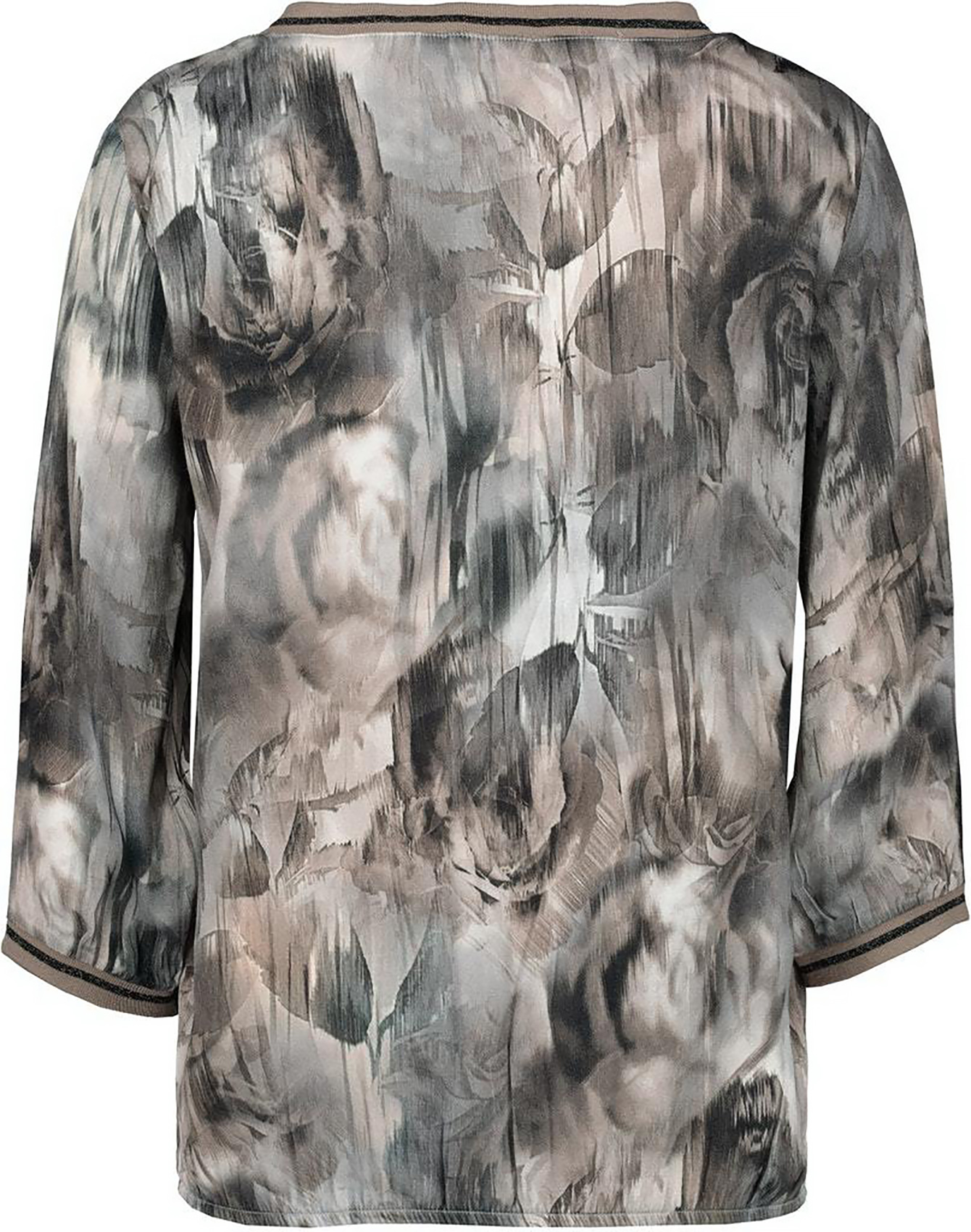 Блуза с абстрактым принтом. Втачной рукав 3/4 , v-образный вырез горловины украшен стразами.