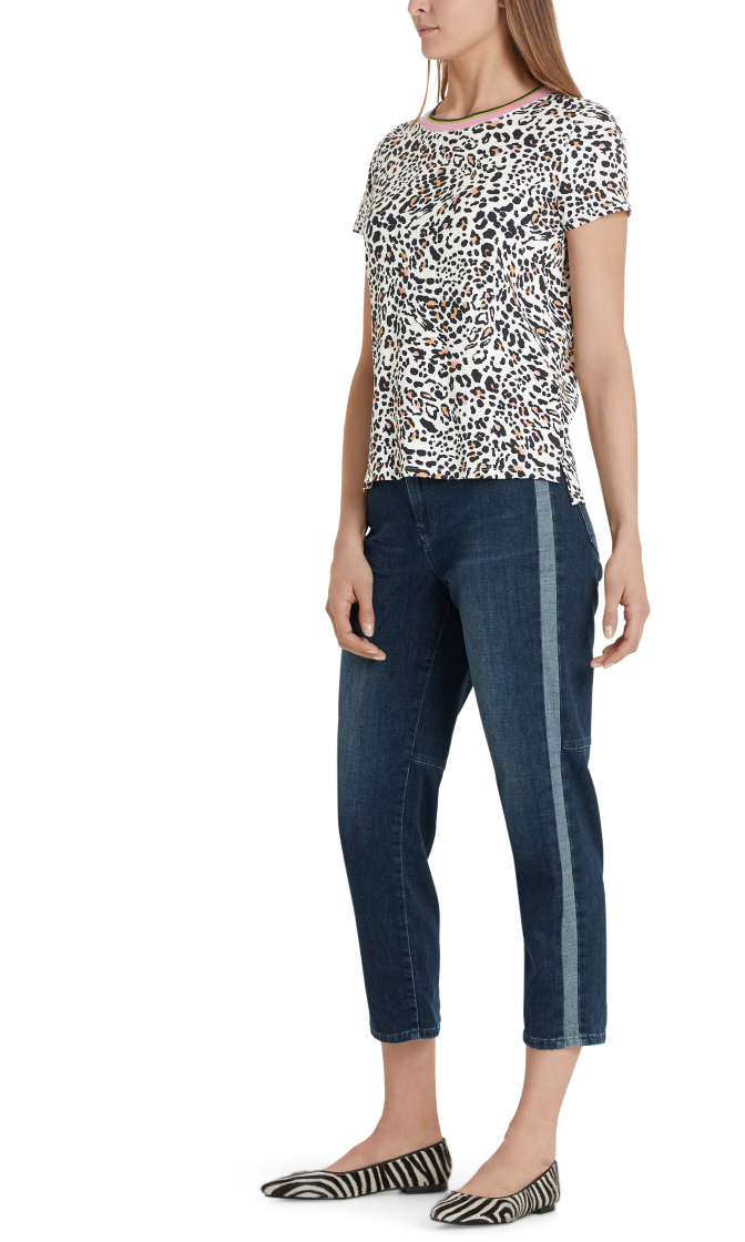 Футболка прямого покроя с анималистическим принтом. Круглый вырез горловины с контрастной обтачкой, короткие втачные рукава. Удлиненная спинка изделия, небольшие разрезы по бокам. Материал из хлопковой смеси приятен к телу и обеспечивает комфорт.