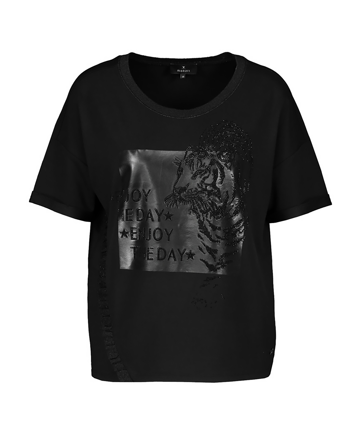 Однотонная футболка свободного силуэта – комфортный вариант для повседневного образа. Широкая круглая горловина. Втачной короткий рукав, спущенная линия плеча. Анималистичный принт в тон футболки.