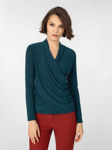 Блуза из трикотажа прилегающего силуэта с воротником стойка, v-образным вырезом горловины, мягкой стойкой и втачным рукавом полной длины. Спереди декоративный запах со сборкой. Идеально сочетается с костюмной группой.