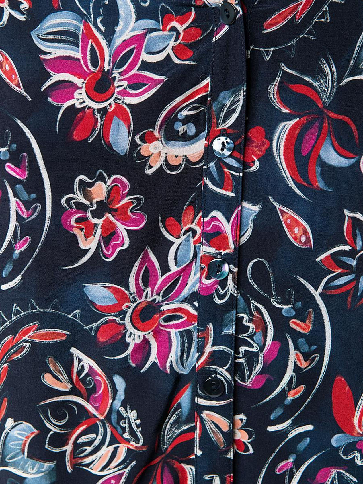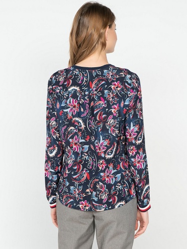 Блузка с контрастным цветочным принтом - стильный акцент в вашем образе! Вискозный материал приятен к телу, а прямой покрой обеспечивает максимальный комфорт. Завершенность дизайну придают круглый вырез, пуговичная планка и трикотажные манжеты на рукавах. Современная женственная модель отлично смотрится как с брюками, так и с юбкой.