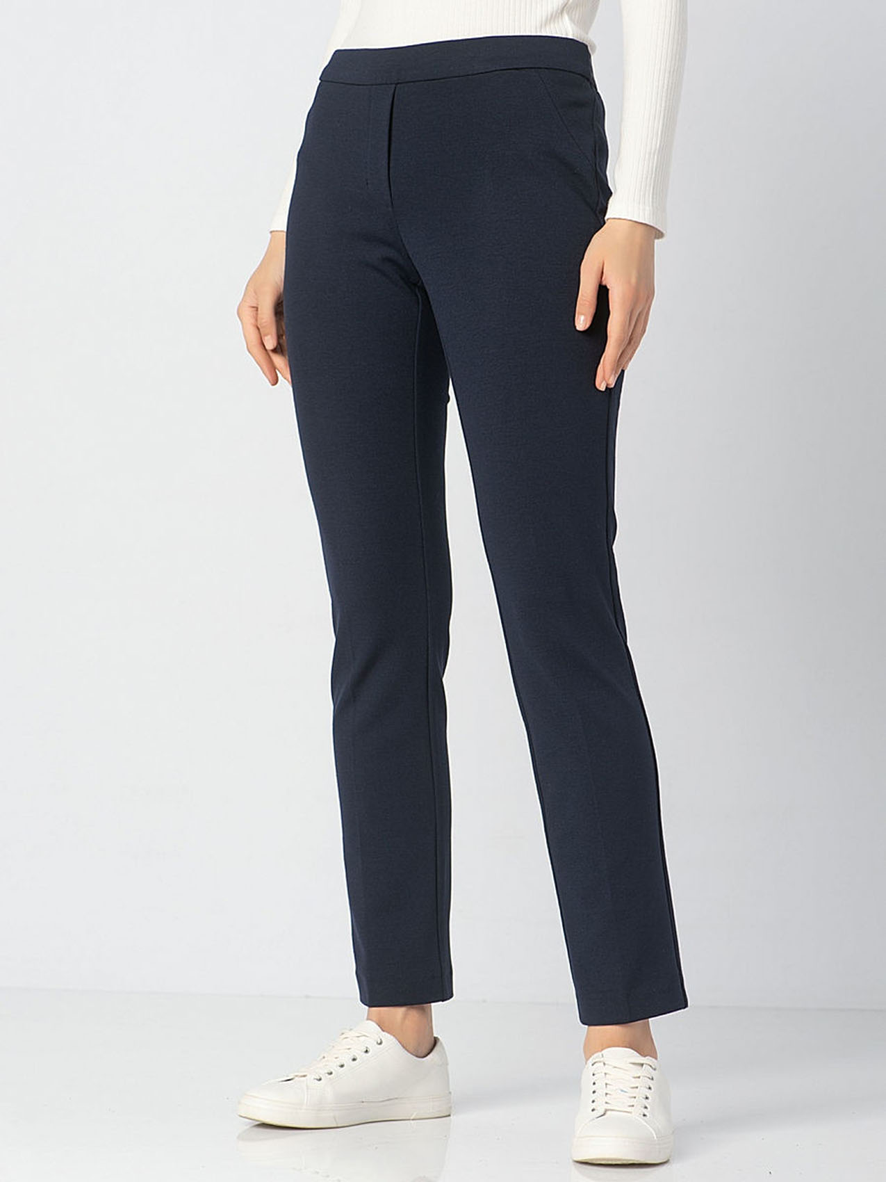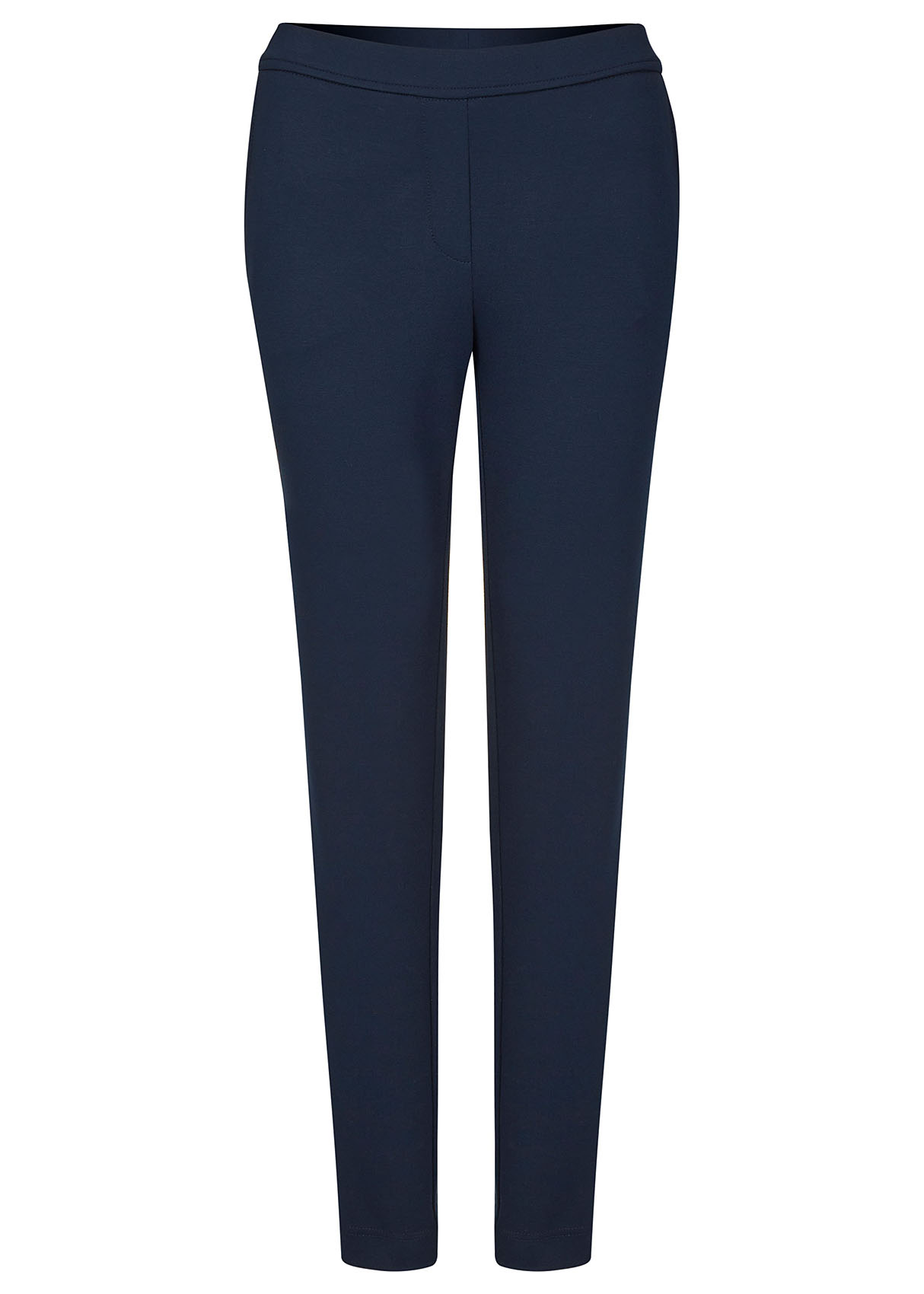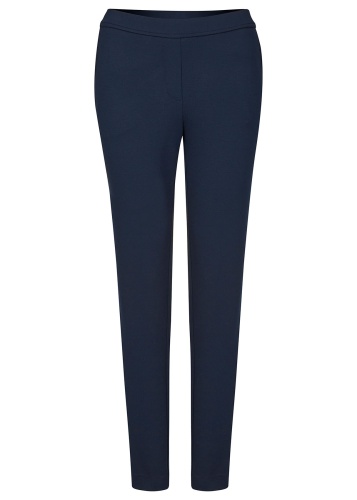 Темно-синие брюки без карманов. Смесь из вискозы и синтетических материалов приятна к телу и обеспечивает идеальную посадку. Силуэт slim подчеркивает линию ног. Брюки простого, сдержанного дизайна предполагают бесчисленные варианты комбинаций.