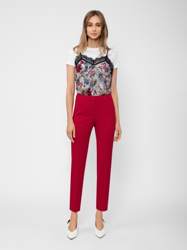 Зауженные книзу брюки на притачном поясе со стрелками и боковыми карманами. Застежка спереди на молнию. Сзади карманы листочки.