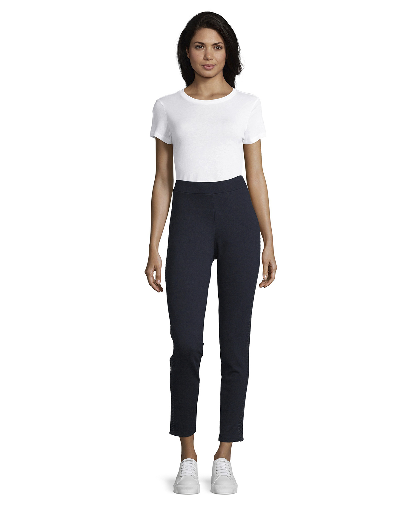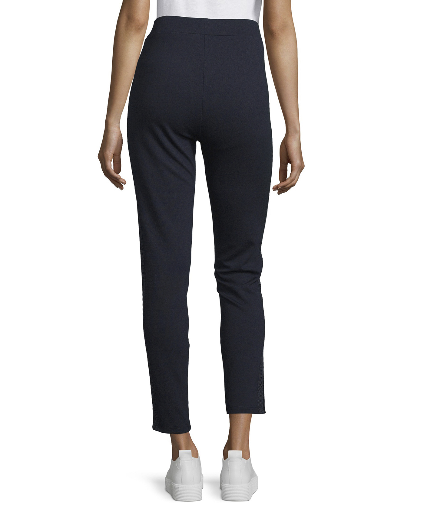 Брюки в спортивном стиле помогут угнаться за модой! Удобная средняя посадка, силуэт slim. Элегантный декор - вставка из сетчатого материала и тесьма с пайетками по бокам. Материал из вискозной смеси приятен к телу и обеспечивает комфорт. Эта модель - отличный выбор для прогулки по городу.