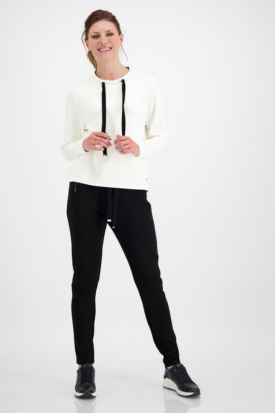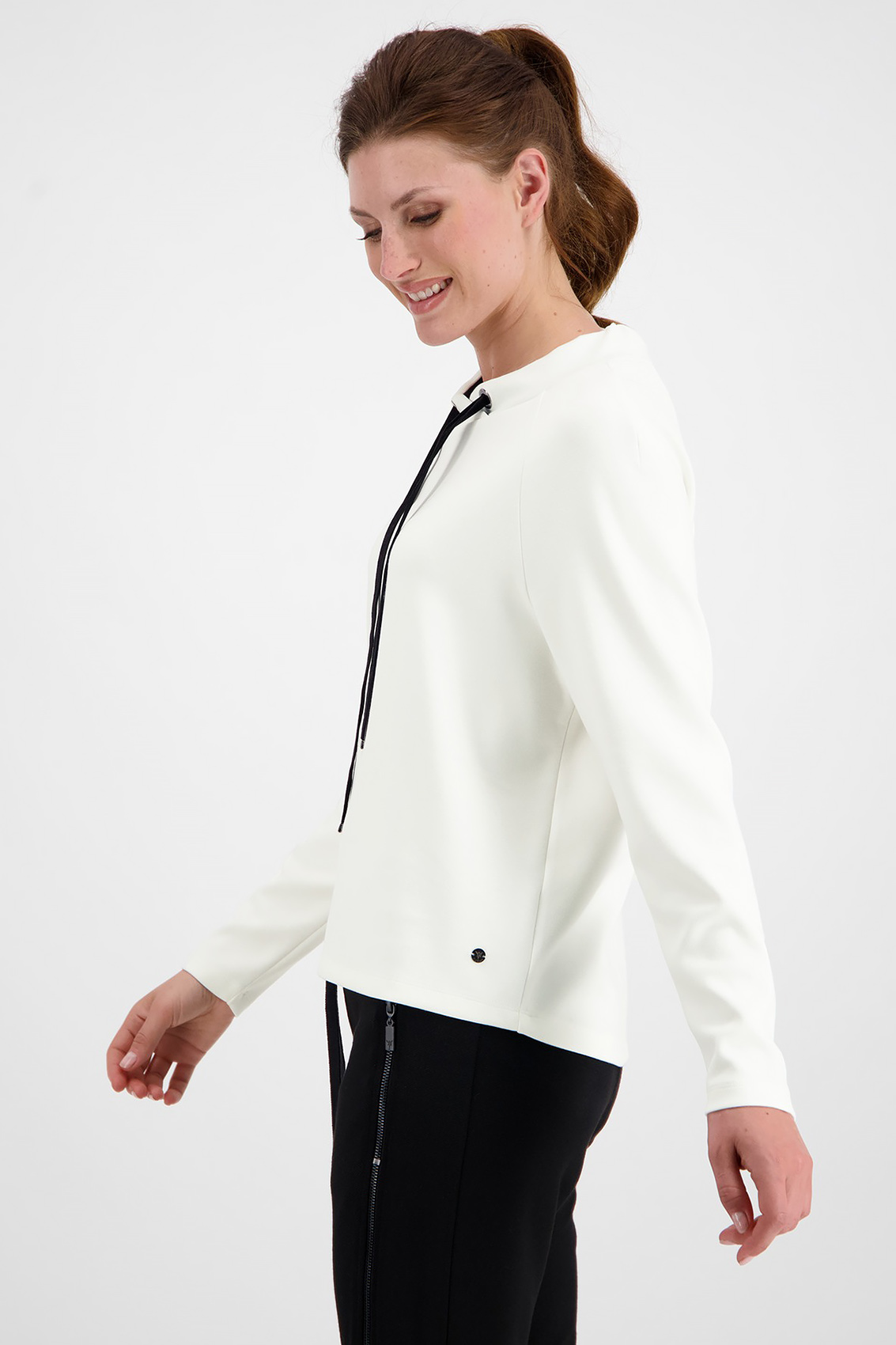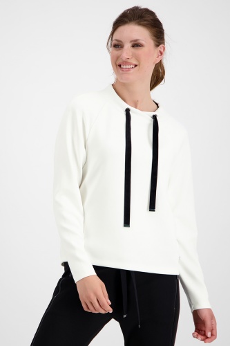 Джемпер из смесовой ткани с воротником стойкой. Воротник джемпера регулирует кулиска с контрастным плоским шнурком. Рукав реглан полной длины. Стильный вариант для спортивного стиля и повседневной носки.