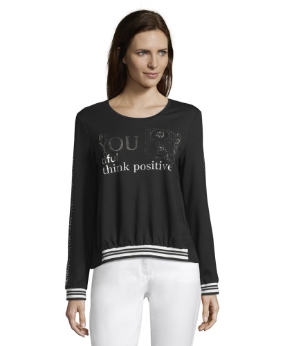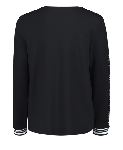 Джемпер прямого покроя. Круглый вырез горловины, удлиненная спинка, длинные рукава на манжетах. Материал из вискозной смеси обеспечивает комфорт. Блестящая отделка вдоль рукавов и декор стразами придают образу гламур. Отличный вариант верха для стильного повседневного образа!
