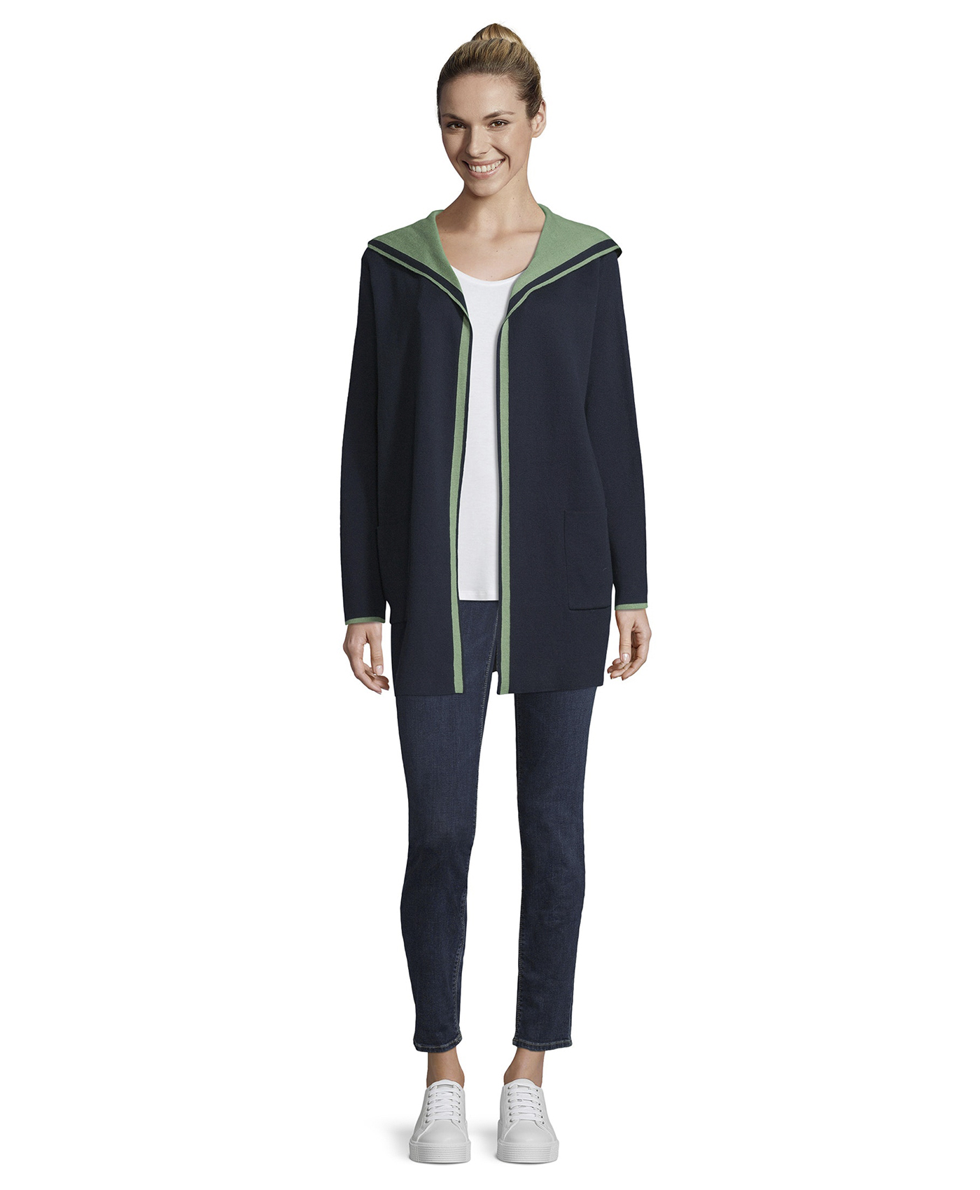 Кардиган с капюшоном. Прямой покрой, длинные рукава, карманы на переде изделия. Сочетание контрастных цветов придает этой модели стильные акценты. Материал из смеси хлопка и эластана обеспечивает комфорт и отличную посадку. Кардиган - необходимая базовая вещь для прохладной погоды.