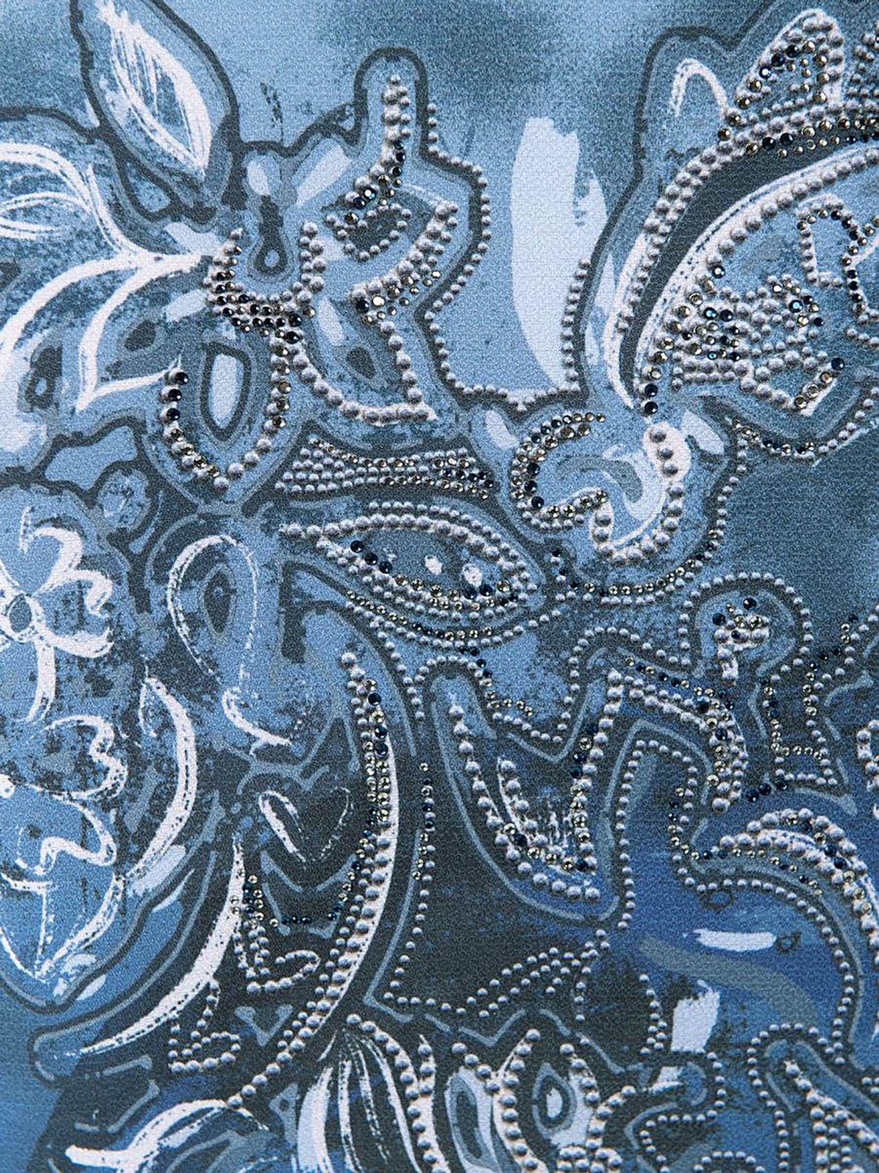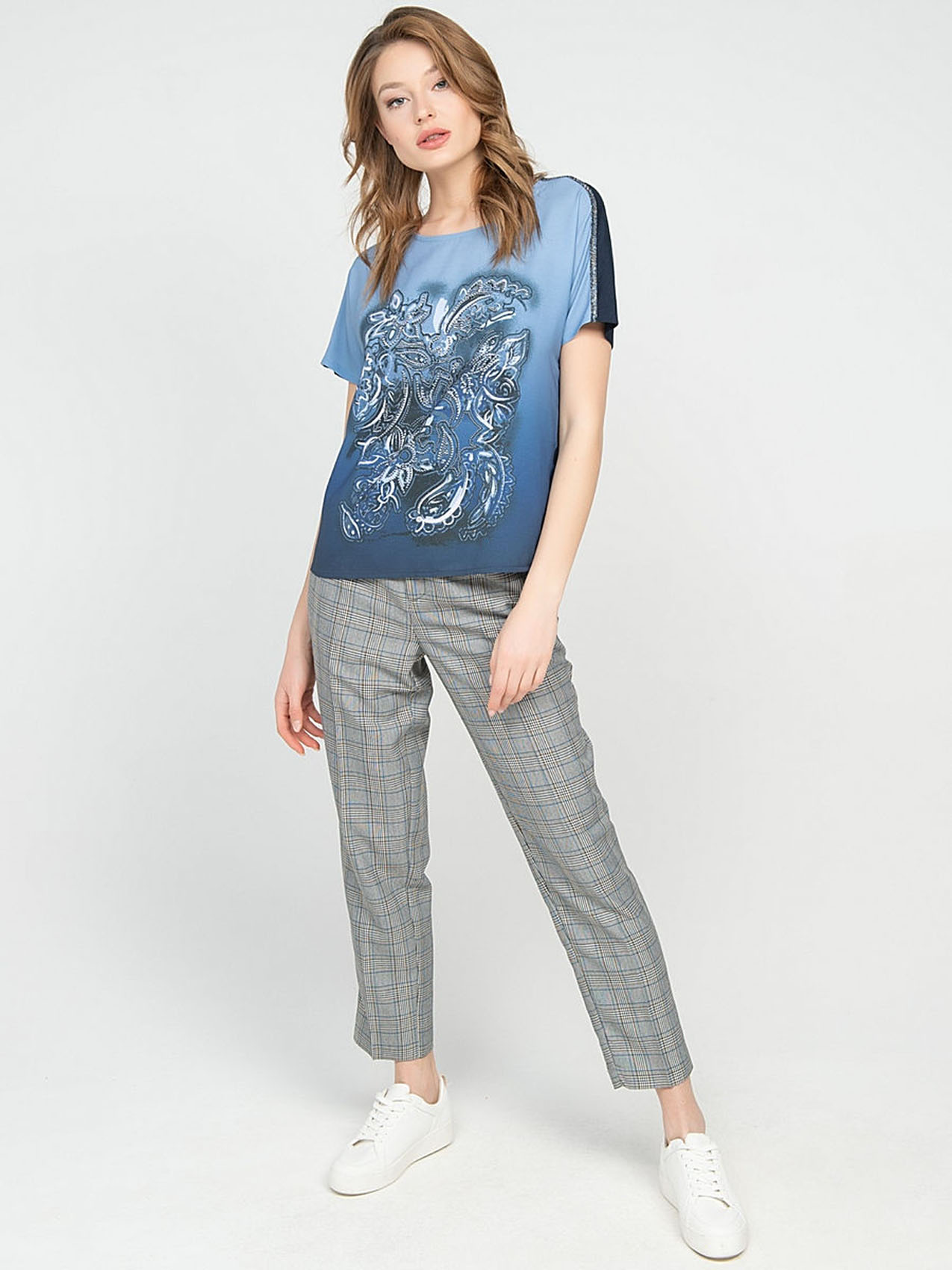 Великолепное сочетание трендов - нежный сине-голубой градиент и цветочный принт на переде футболки. Спинка футболки выполнена из однотонного темно-синего материала. Элегантный акцент - декоративная лента по линии плеча. Мягкий материал из смеси вискозы и эластана гарантирует отличную посадку, а короткий цельнокроеный рукав придает образу легкость и непринужденность. Футболка будет замечательным компаньоном как в брючном, так и в юбочном комплекте.