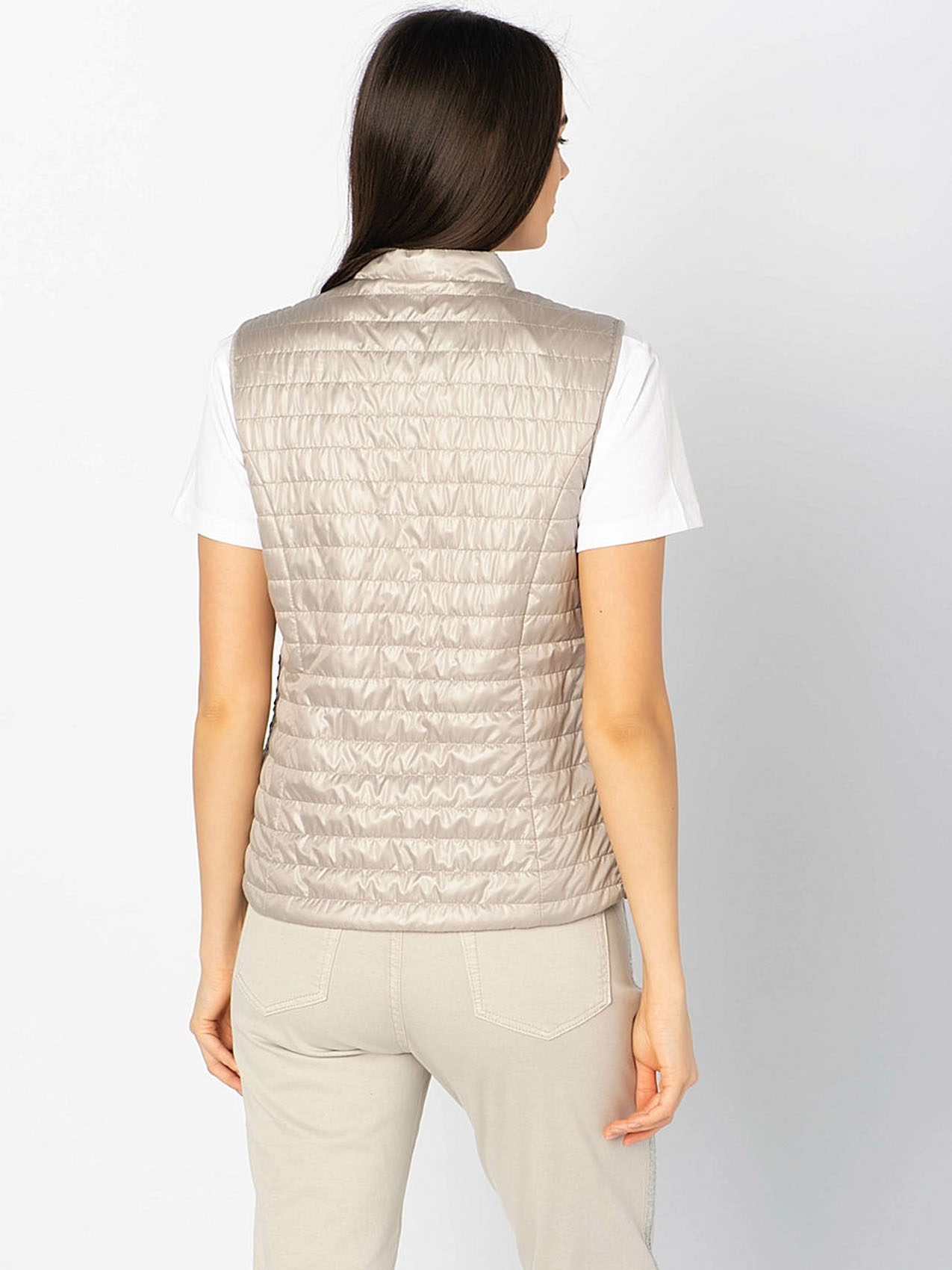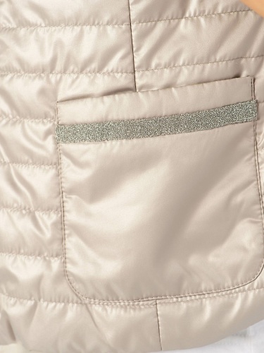 Великолепный стеганый жилет из легких синтетических волокон. Небольшой воротник-стоечка. Замок по всей длине и карманы спереди обеспечивают удобство. Завершает дизайн декоративная лента на карманах.