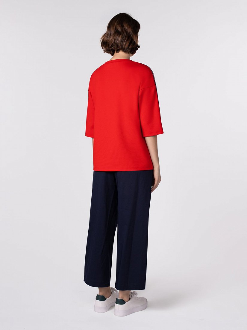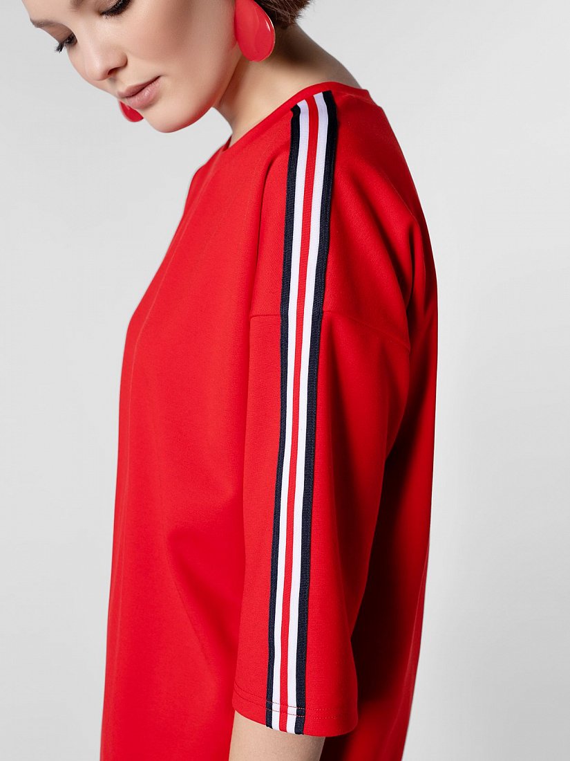 Блуза из трикотажа прямого силуэта с круглой горловиной, спущенным плечом и укороченным втачным рукавом. На плечевых и боковых швах контрастная декоративная тесьма в полоску.