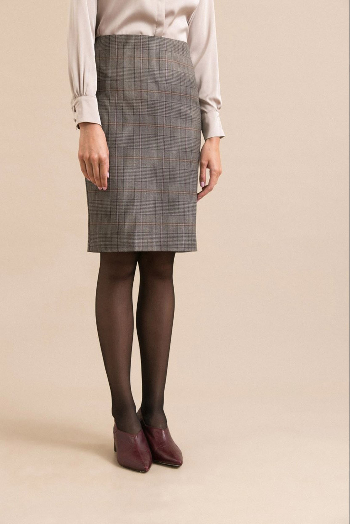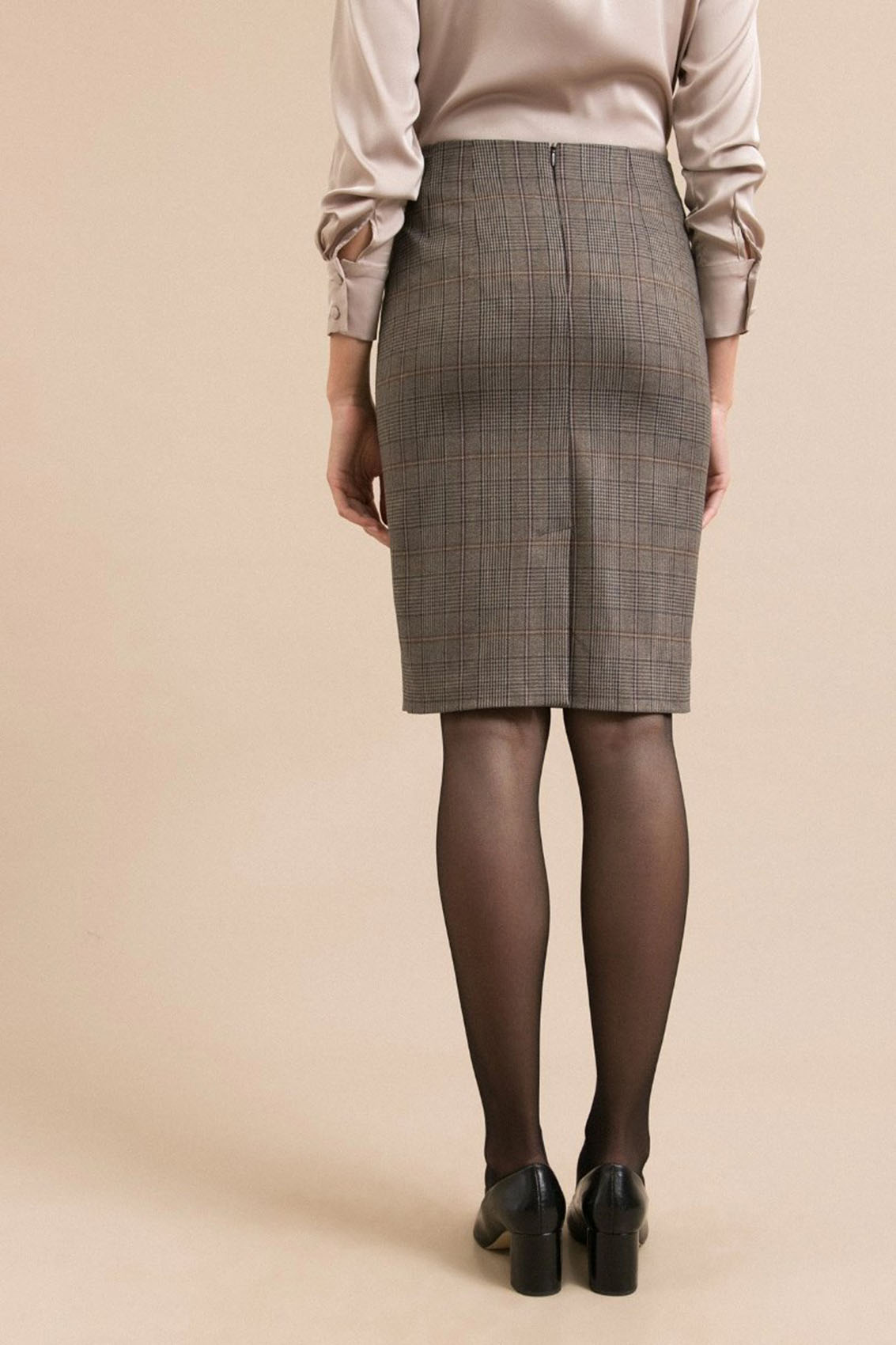 Зеленая юбка в клетку. Зауженная модель средней посадки, выполнена без пояса. Сзади в среднем шве расположена застежка-молния и высокая шлица. Юбка служит базовой моделью в гардеробе для формирования образов в любых стилистических направлениях.