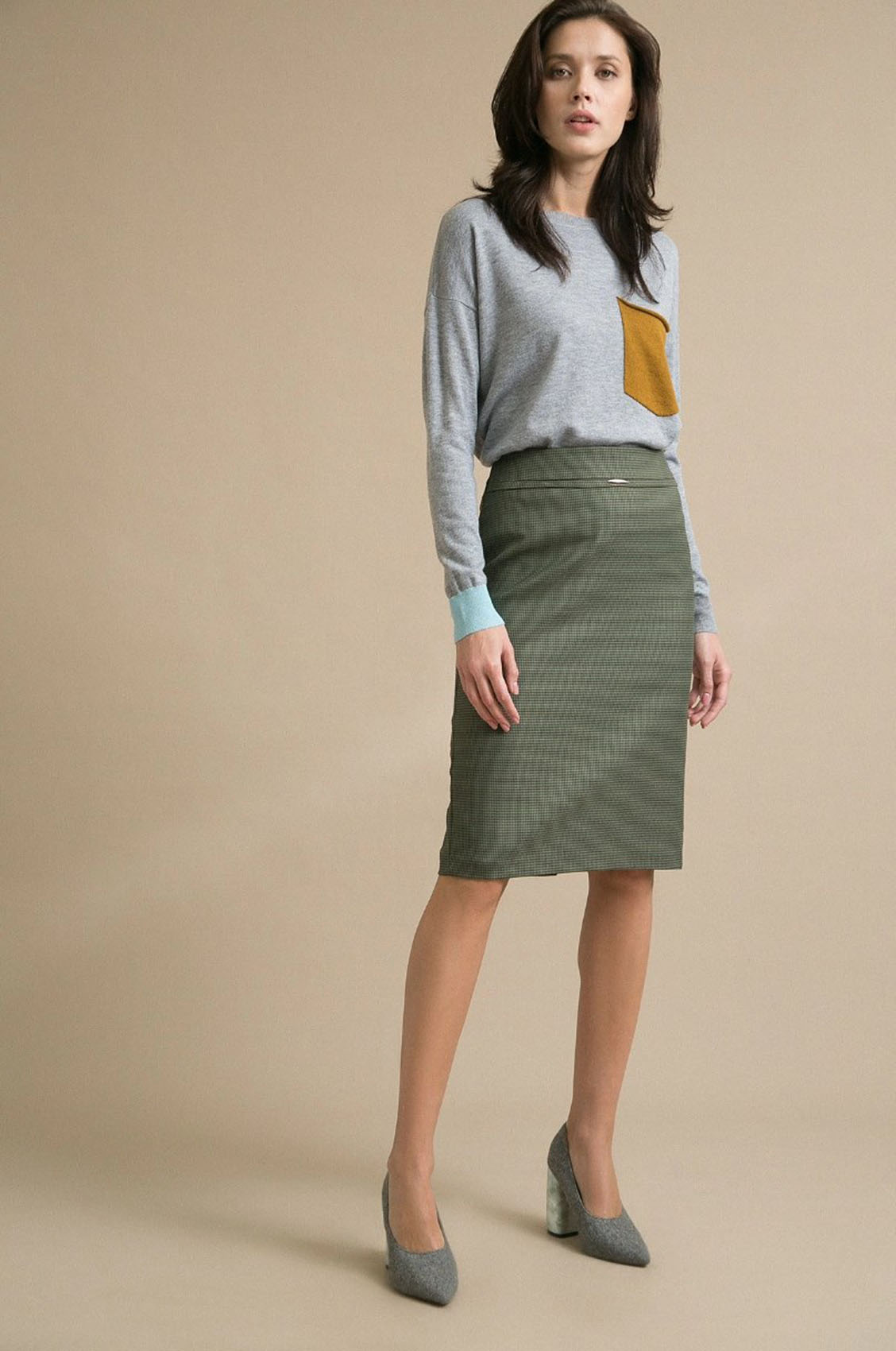Юбка-карандаш с орнаментом "гусиная лапка". Модель имеет притачной пояс с металлическим элементом и потайную застежку-молнию сзади в среднем шве. Юбка декорирована сзади веерной складкой. Удачный выбор для создания повседневных и деловых образов.