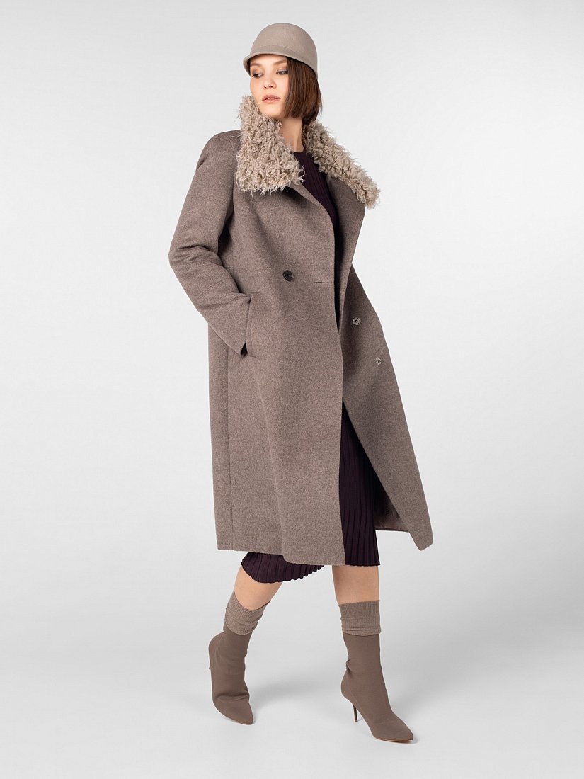 Пальто прямого силуэта длиной чуть ниже колена. Втачной рукав, застёжка на роговые пуговицы, широкий воротник-стойка, вертикальные карманы-листочки. Горизонтальные подрезы на полочке, спинке и рукавах. Съёмный воротник-стойка из искусственного меха. Произведено с ветрозащитной мембраной Raft Pro. Утеплитель DuPont Sorona из биопуха. Изготовлено из шерстяной ворсовой ткани цвета "бежевый меланж".