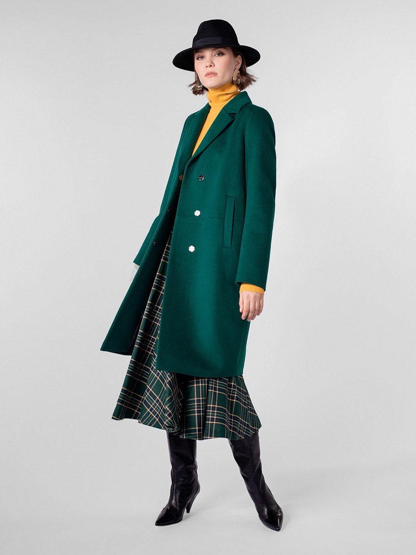 Пальто прямого силуэта длиной выше колена. Втачной рукав, застёжка на пришивные кнопки, английский воротник, горизонтальный подрез на полочке и спинке, вертикальные карманы-листочки. Ветрозащитная мембрана Raft Pro. Изготовлено из ворсовой шерстяной ткани изумрудного цвета.