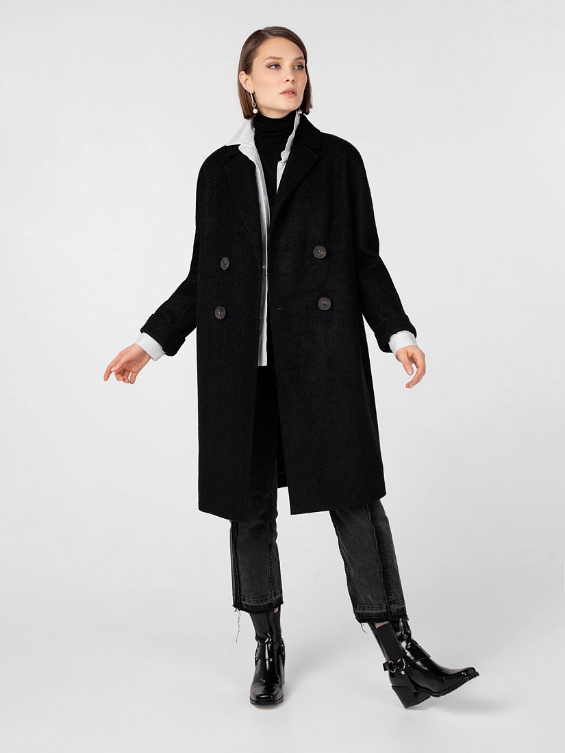 Двубортное пальто силуэта "кокон" длиной до колена. Рукава-кимоно с отворотами по низу, застёжка на крупные роговые пуговицы, английский воротник, карманы-листочки. Выполнено с открытыми срезами и декорировано отделочными строчками. Произведено с ветрозащитной мембраной Raft Pro. Изготовлено из варёной шерсти чёрного цвета.
