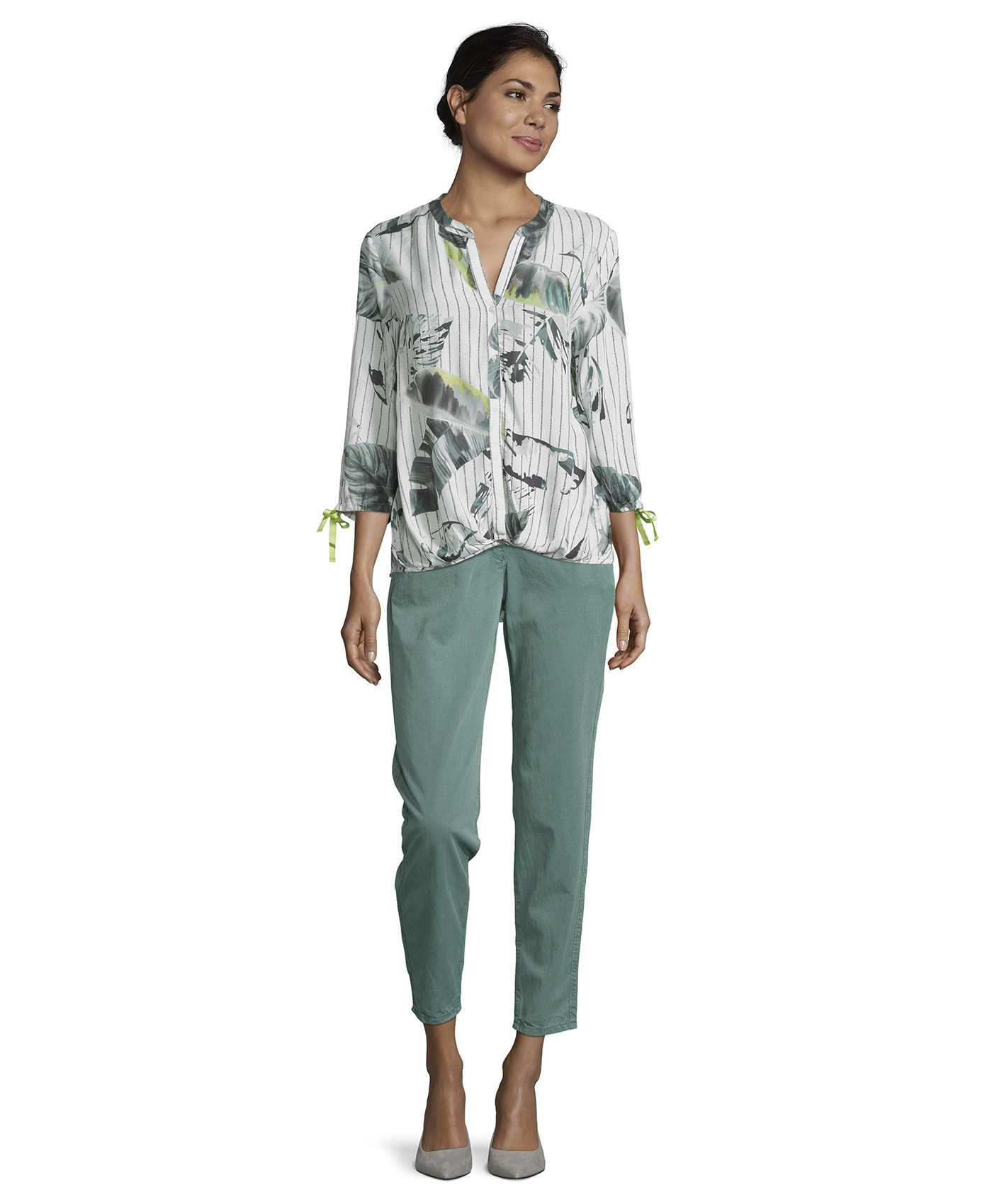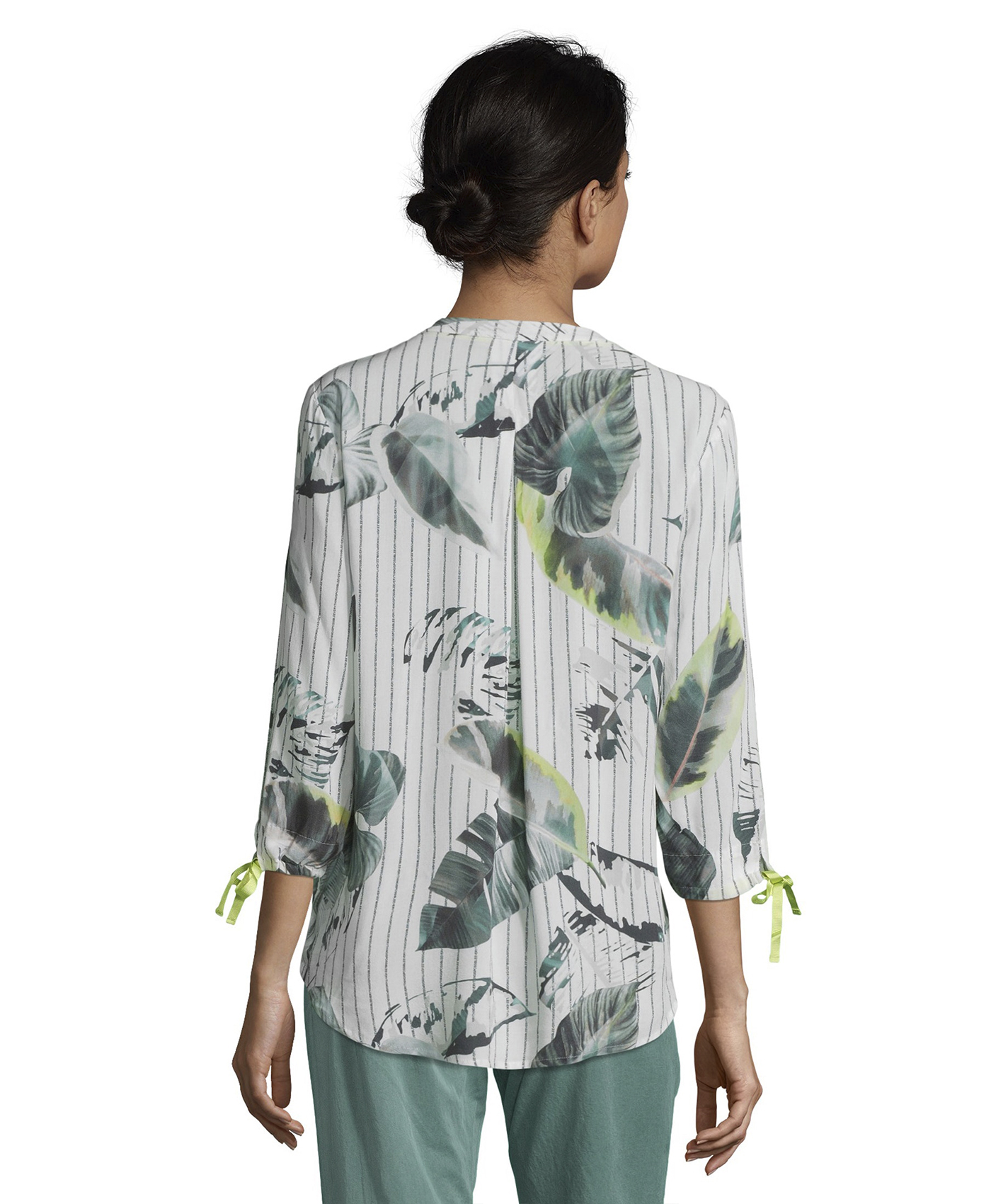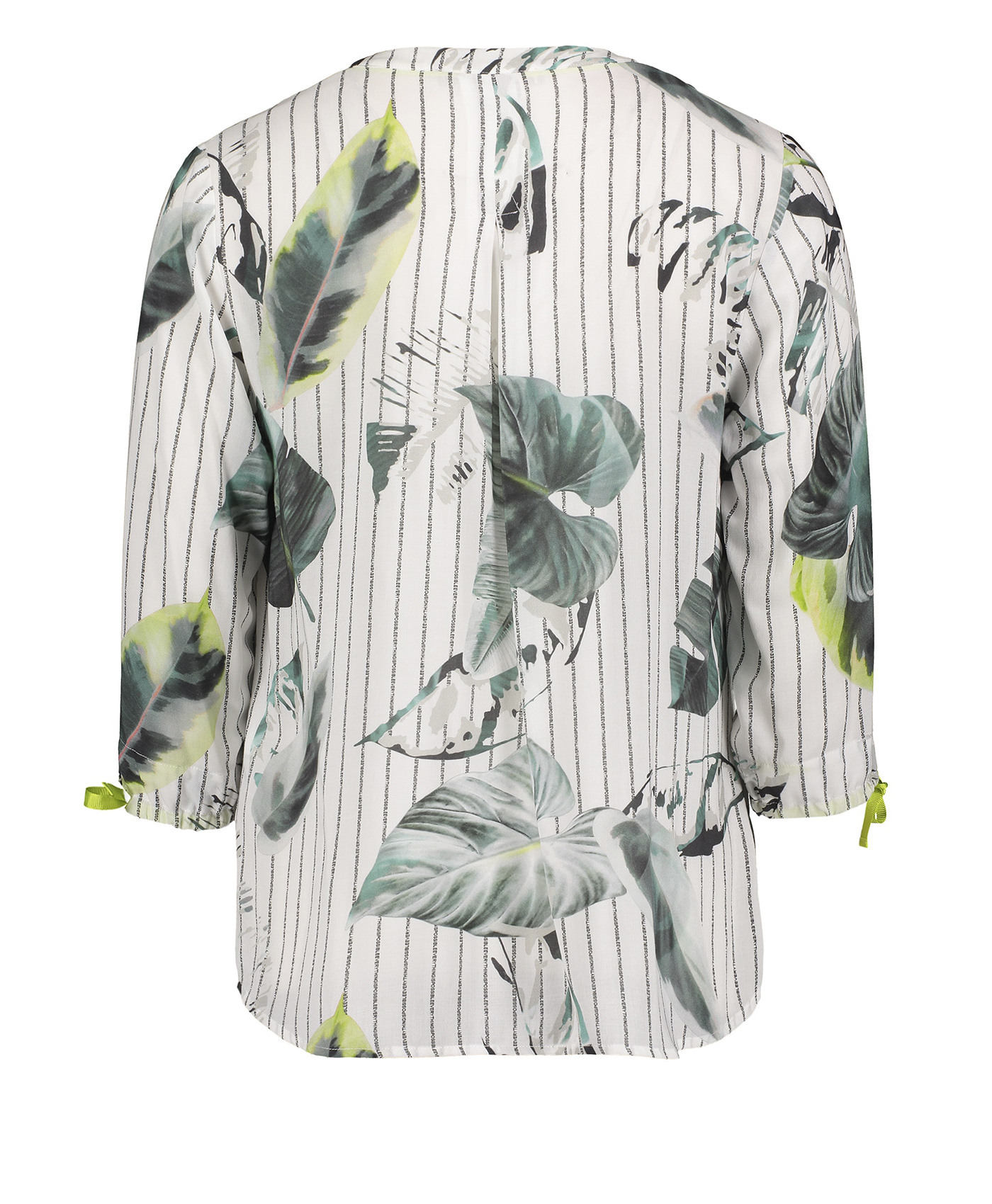Блуза является необходимым элементом женского гардероба. Удлиненная спинка изделия, небольшие разрезы по бокам, рукава 3/4 на завязках. Принт с мелкой надписью и трендовым тропическим мотивом. Хлопковый материал приятен к телу и обеспечивает комфорт. Блуза стильно смотрится с однотонными брюками и любой обувью.