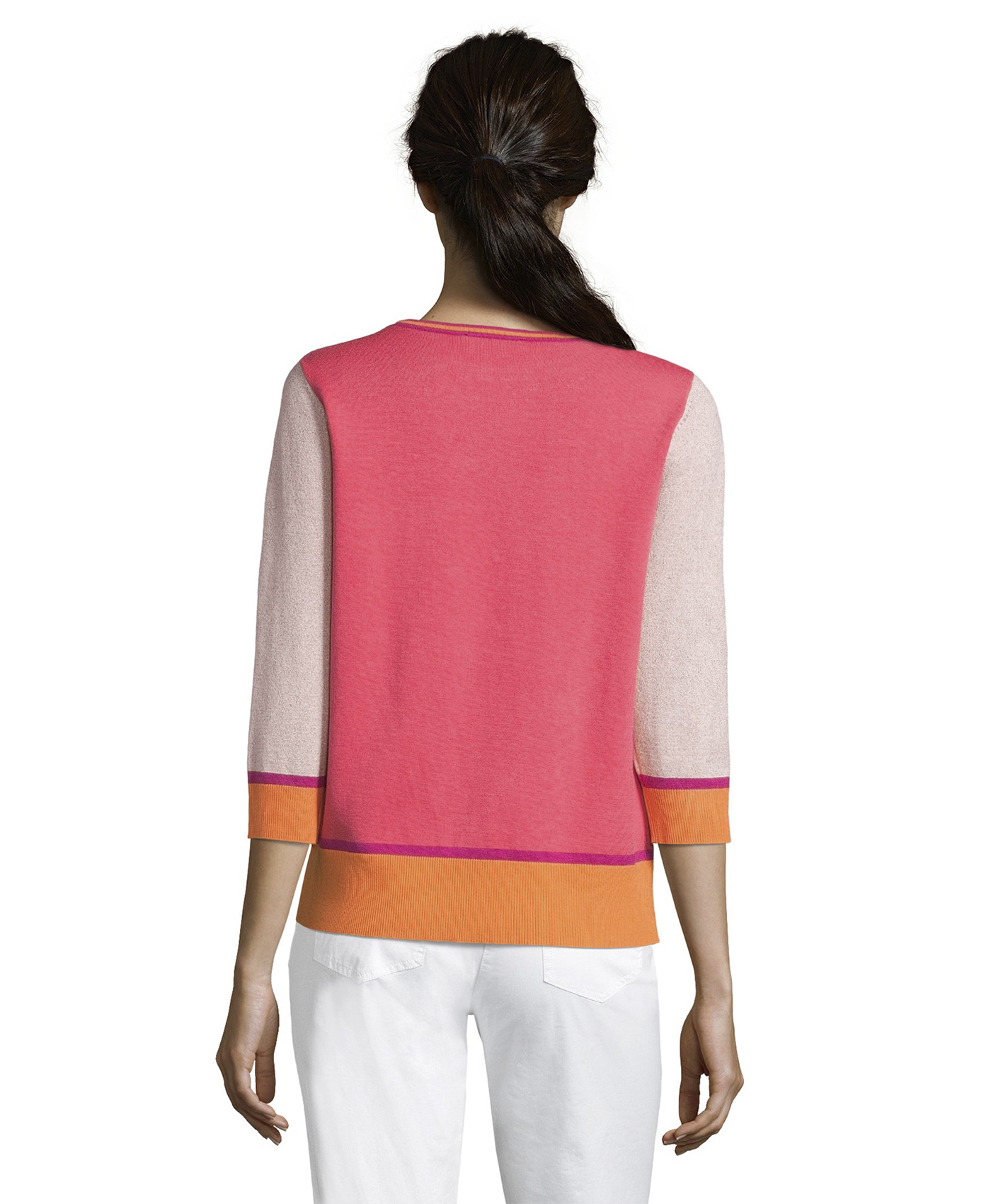 Новая вариация модного дизайна в стиле колор-блок! Прямой покрой, вырез горловины "лодочка", рукава 3/4. Материал из вискозной смеси приятен к телу и обеспечивает комфорт. Нить люрекса в составе материала придает изделию гламурный блеск. Этот джемпер гарантирует создание современного образа с любым однотонным вариантом низа и любой обувью.