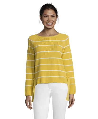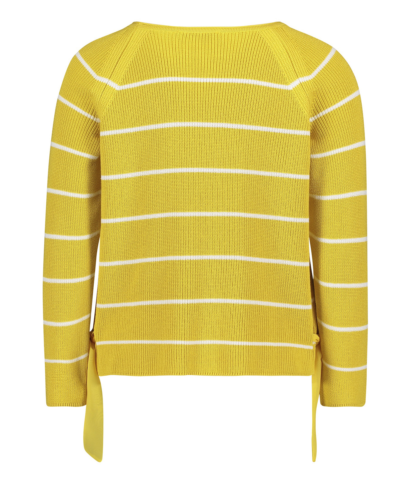 Новая вариация трендовой полоски! Джемпер прямого покроя с длинными рукавами и горловиной-лодочкой. Элемент романтического стиля - декоративные ленты-завязки по бокам. Материал из хлопковой смеси приятен к телу. Этот джемпер создает женственный образ даже в сочетании с брюками.