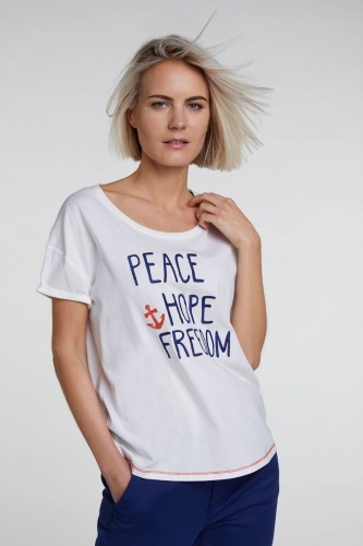 Для тех, кто скучает по морю! Футболка с вышивкой и пайетками. Модный свободный крой. Широкий круглый вырез горловины, короткие рукава со спущенным плечом. Контрастная отстрочка по низу изделия. Хлопковый материал приятен к телу и обеспечивает комфорт. Эта футболка - прекрасный компаньон для образа как с брюками, так и с юбкой.