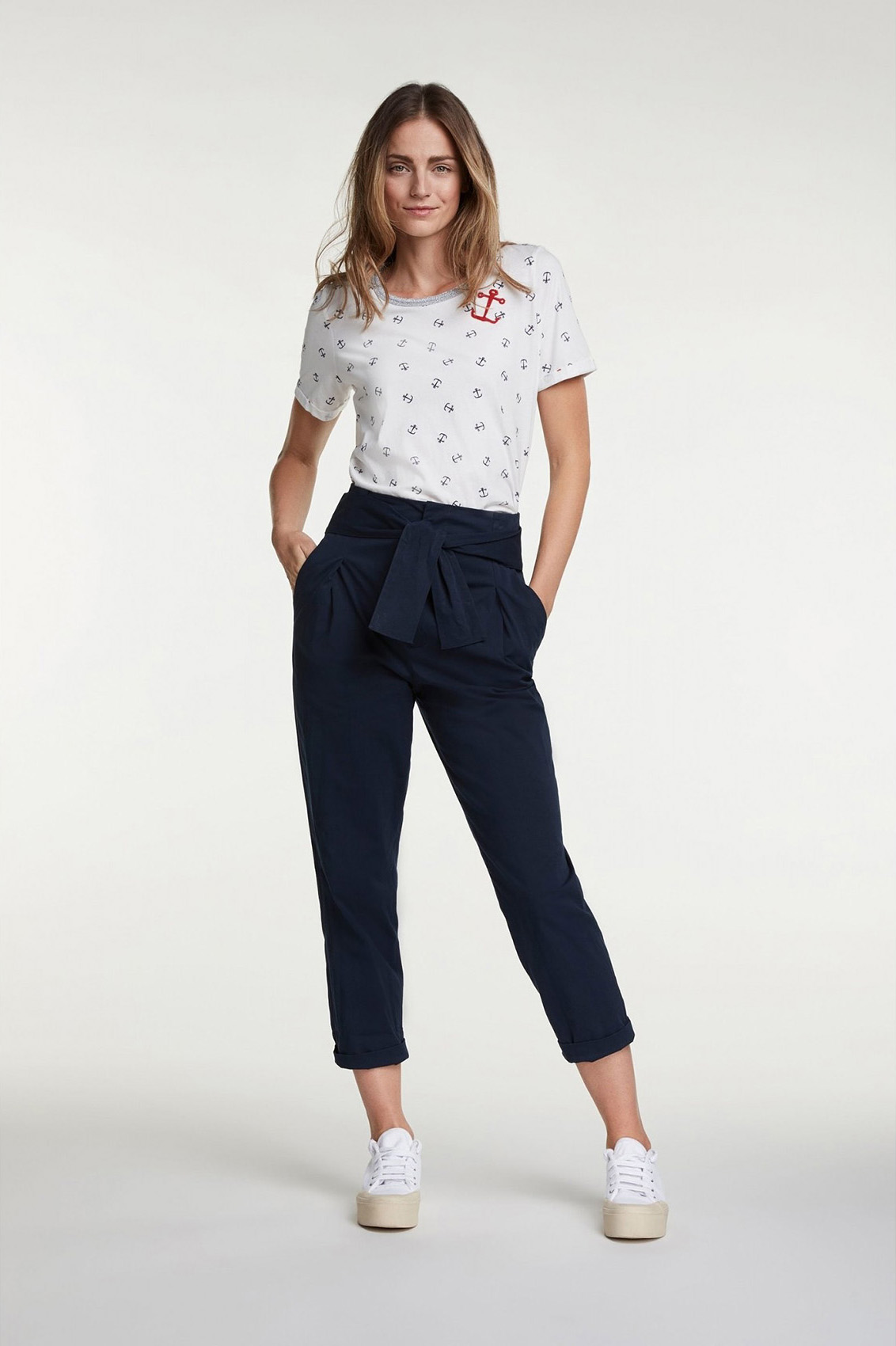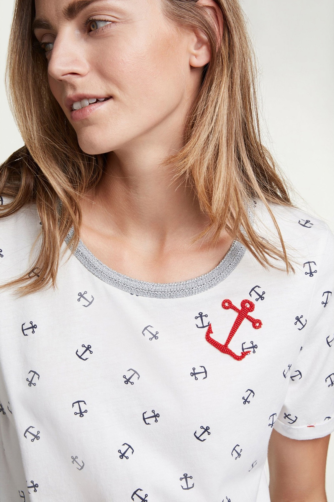 Для тех, кто скучает по морю! Футболка с принтом в виде якорей и украшением из бисера. Прямой крой. Широкий круглый вырез горловины с обтачкой, короткие рукава с фиксированными манжетами. Контрастная отстрочка по низу изделия. Хлопковый материал приятен к телу и обеспечивает комфорт. Эта футболка - прекрасный компаньон для образа как с брюками, так и с юбкой.