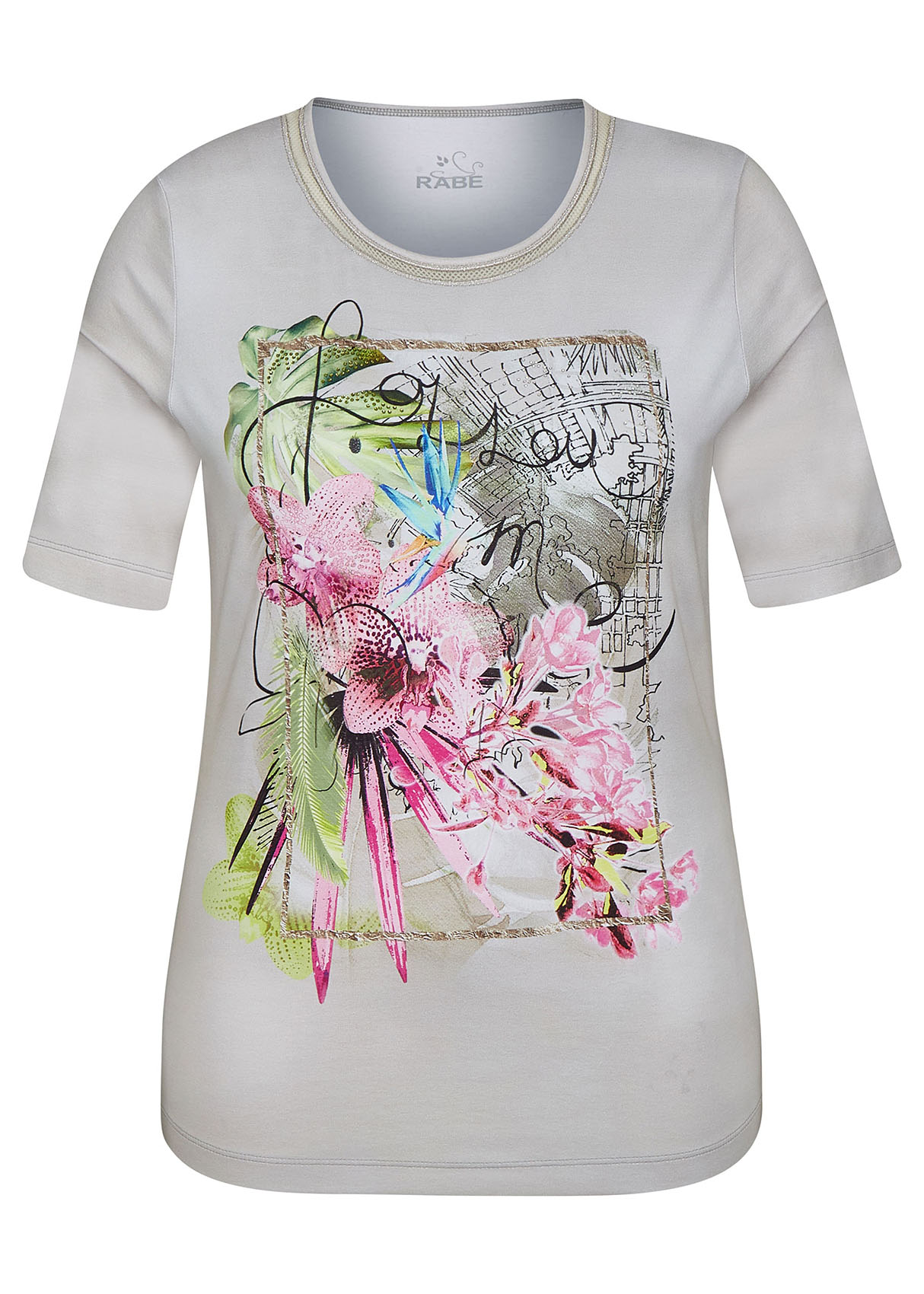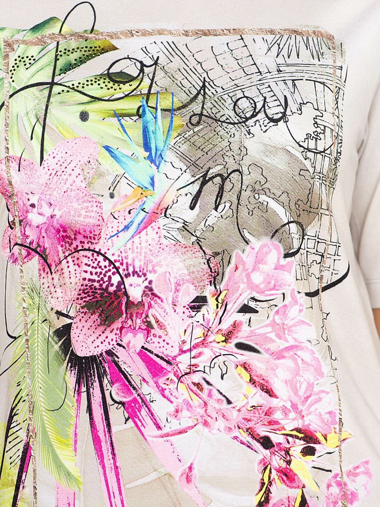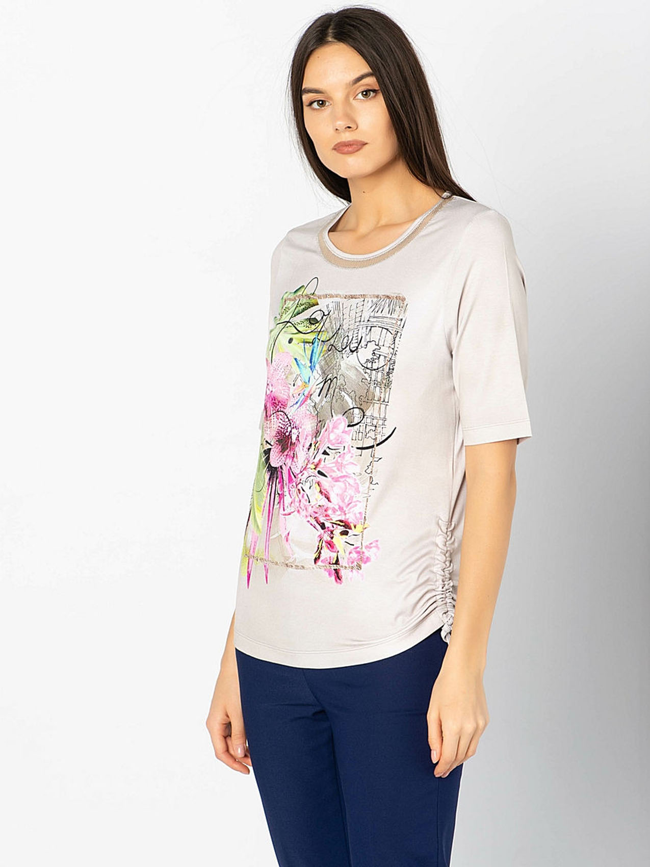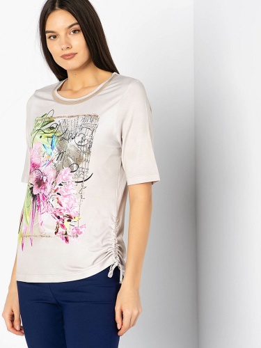 Мечтаете о тропиках? Тогда эта футболка - именно то, что нужно! Приятная расцветка и трендовый принт с изображением экзотических цветов перенесет вас в теплые края. Мягкий материал из смеси вискозы и эластана гарантирует отличную посадку, а рукав 1/2 придает образу легкость и непринужденность. Футболка будет замечательным компаньоном как в брючном, так и в юбочном комплекте.
