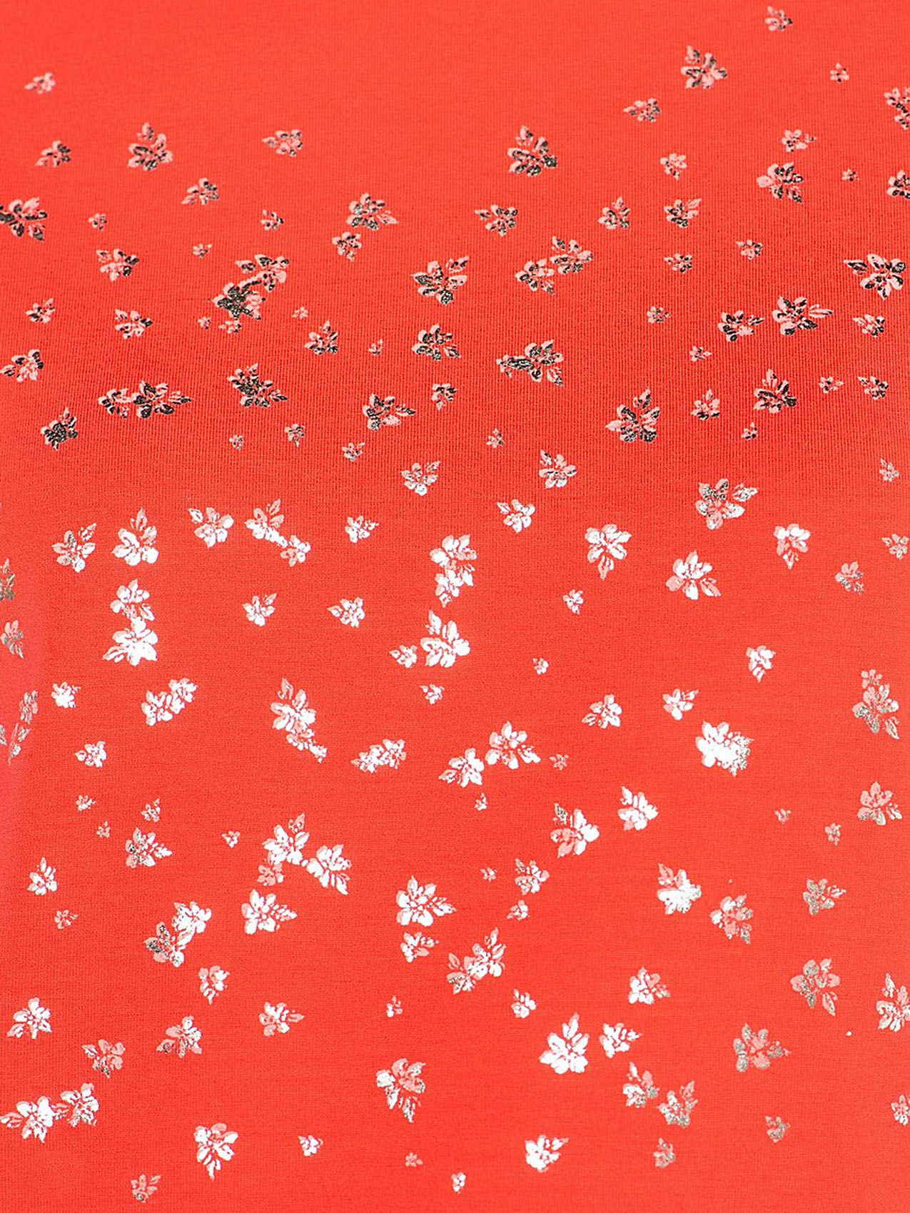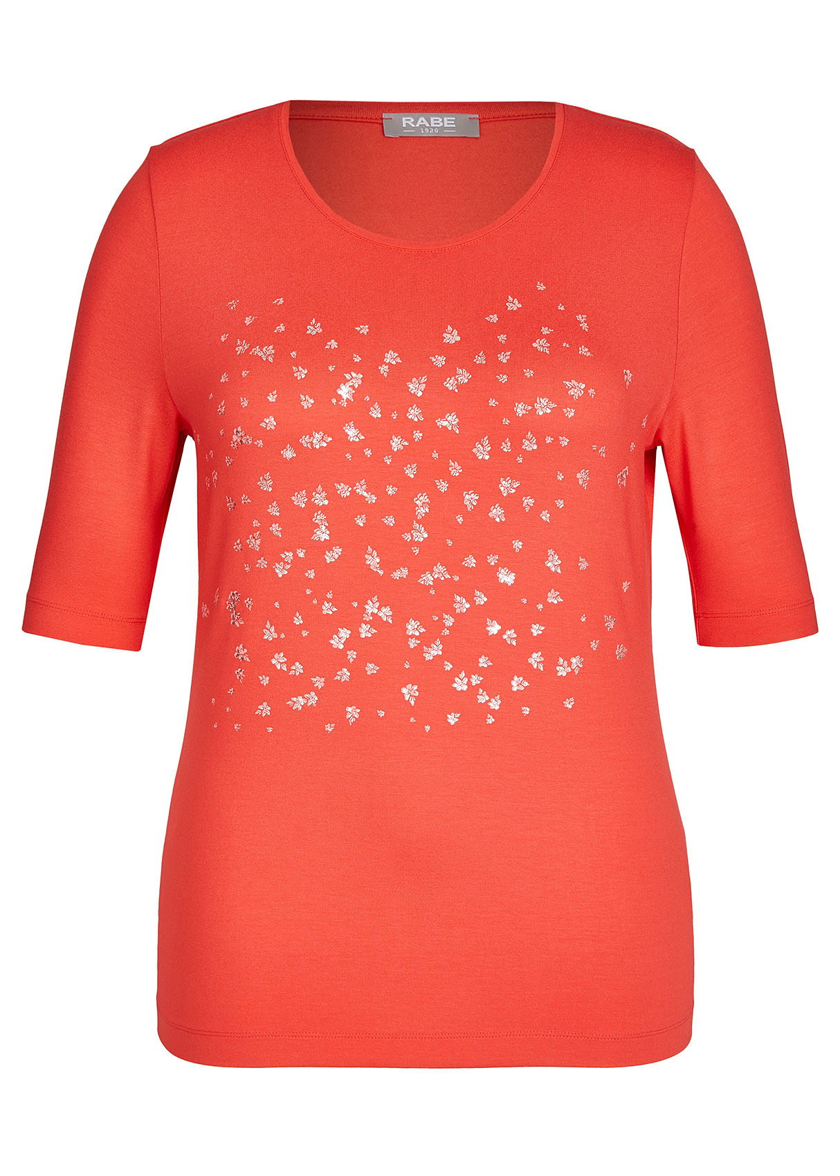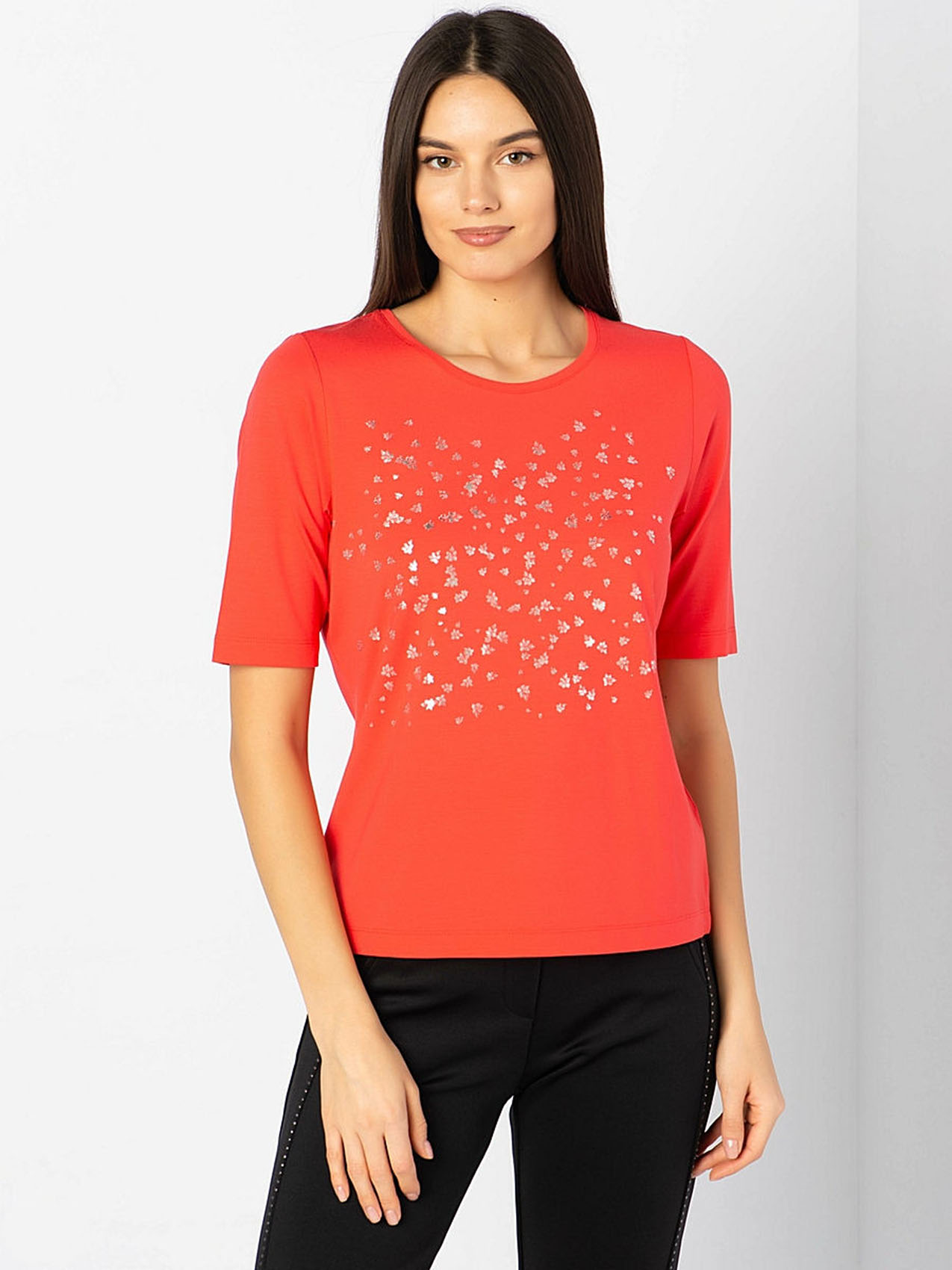 Яркие краски лета - для вас! Футболка трендового цвета с серебристым цветочным принтом. Мягкий материал из смеси вискозы и эластана гарантирует отличную посадку, а рукав 1/2 придает образу легкость и непринужденность. Слегка приталенный силуэт подчеркивает женственность. Универсальная футболка прекрасно смотрится как с классическим костюмом, так и со спортивным.