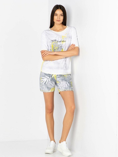 Футболка с трендовым тропическим принтом и яркими акцентами. Яркая декоративная отстрочка. Слегка приталенный силуэт. Вырез "лодочка". Рукава 1/2. Приятный к телу материал из смеси хлопка и эластана. Длина изделия по спинке: 65 см.