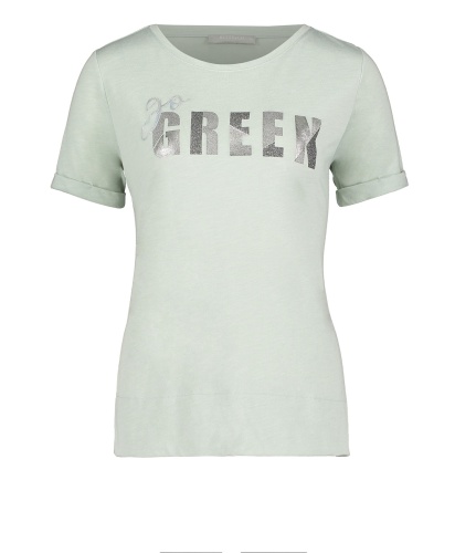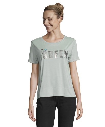 Футболка слегка приталенного силуэта подчеркивает достоинства фигуры. Круглый вырез горловины, короткие рукава с фиксированными манжетами. Металлизированный принт с надписью. Эта универсальная модель будет отлично смотреться как с брюками, так и с юбкой.