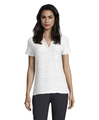 Однотонная футболка прямого покроя - абсолютно необходимая вещь в гардеробе. Короткие рукава, V-образный вырез горловины с отделкой тесьмой. Интересная фактура ткани привлекает внимание. Футболка отлично сочетается как с брюками, так и с юбкой.
