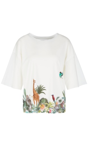 Футболка свободного кроя. Круглый вырез горловины, рукава 1/2 со спущенным плечом. Принт с тропическими мотивами. Приятный к телу материал из хлопковой смеси.