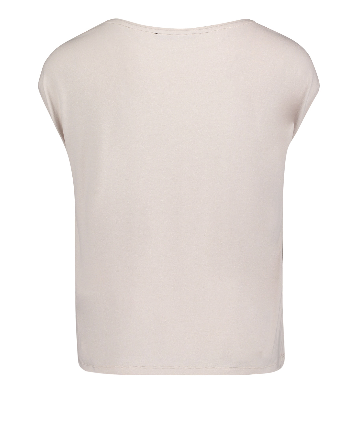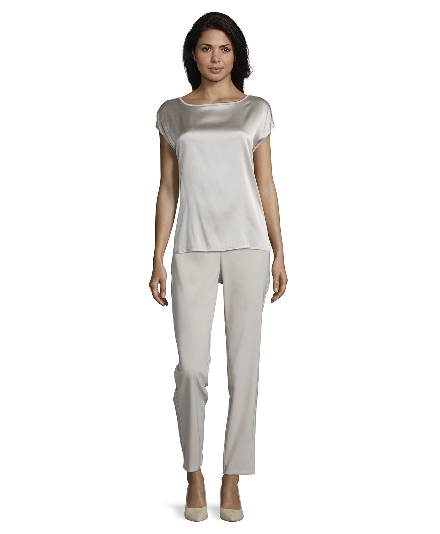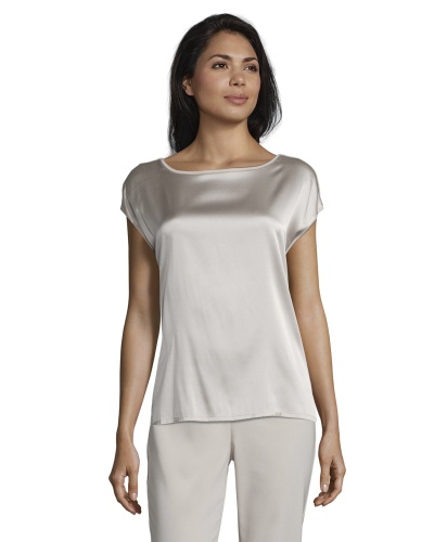 Однотонный топ - базовая модель, которая является обязательной вещью в любом гардеробе. Топ прямого покроя с вырезом-лодочкой и короткими цельнокроеными рукавами. Блестящий атласный перед изделия контрастирует с матовой спинкой. Материал из смеси шелка и эластана обеспечивает комфорт и идеально подходит для теплого времени года. В этом лаконичном и элегантном топе вы будете выглядешь шикарно, независимо от выбранного варианта низа и обуви.