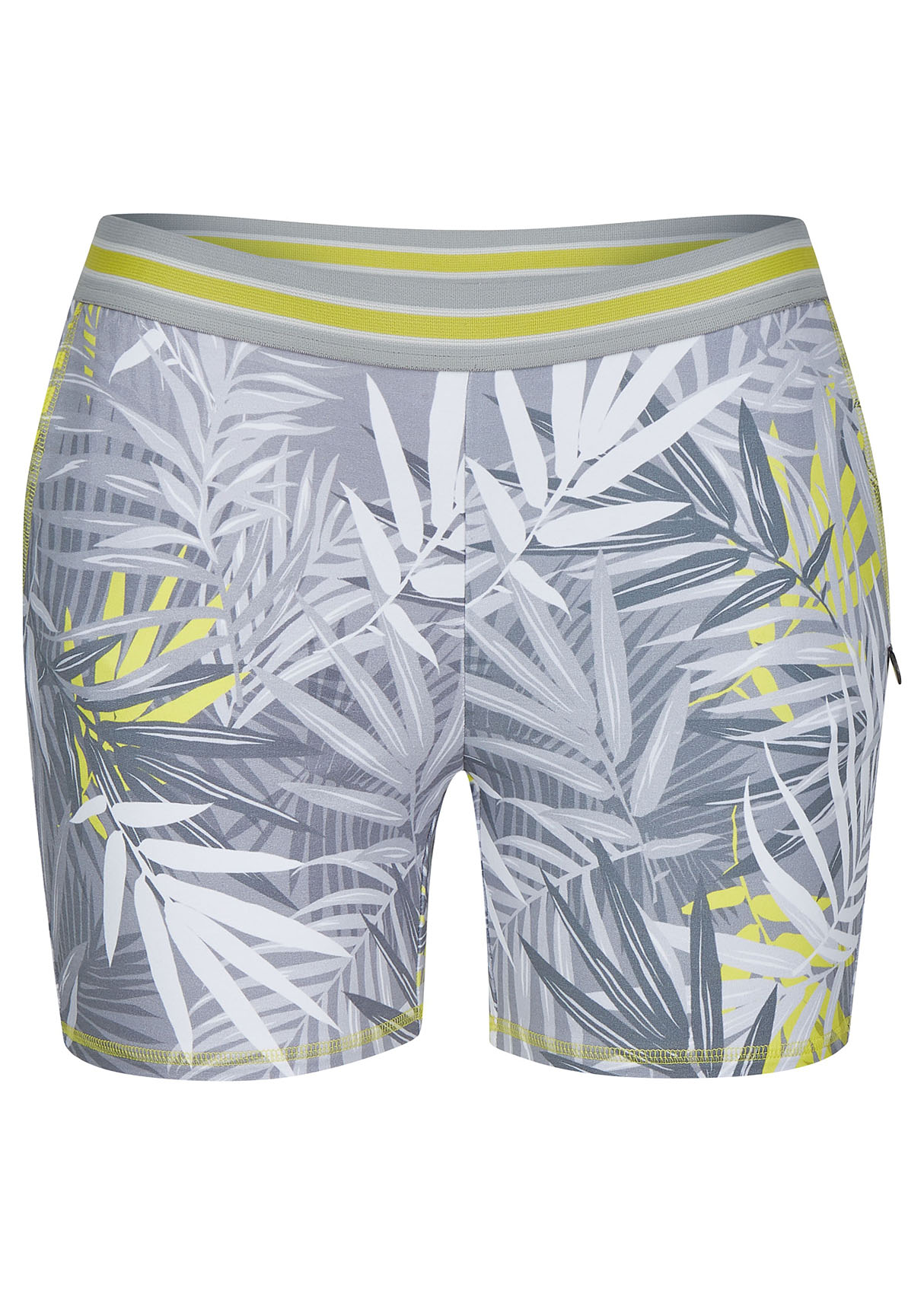 Шорты с прорезными карманами. Трендовый принт с тропическими мотивами, яркие цветовые акценты. Эластичная лента на поясе. Приятный к телу материал из смеси хлопка и эластана.