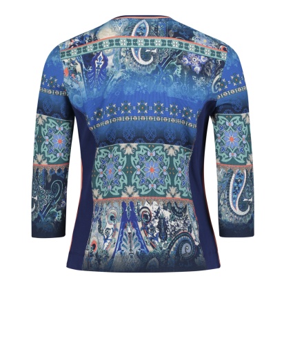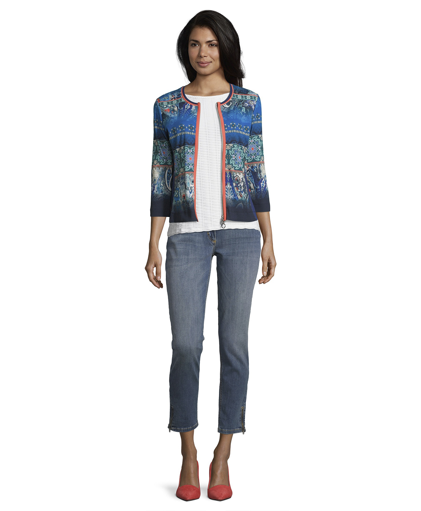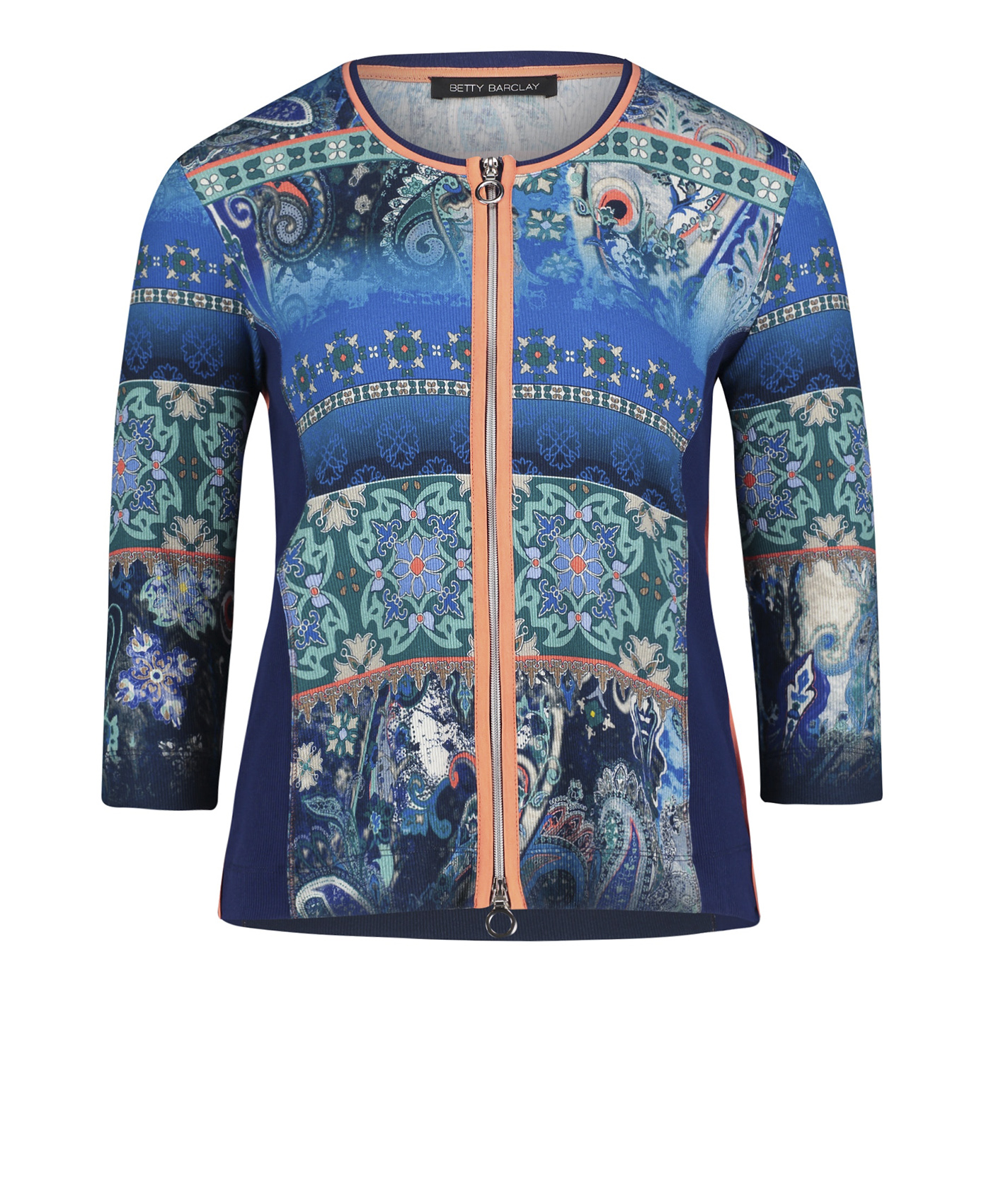 Блейзер приталенного силуэта подчеркивает достоинства фигуры. Круглый вырез горловины, застежка-молния, рукава 3/4. Материал из хлопковой смеси обеспечивает комфорт. Этнический принт и красивое сочетание контрастных цветов непременно обратят на себя внимание. Эта яркая вещь освежит любой комплект одежды!