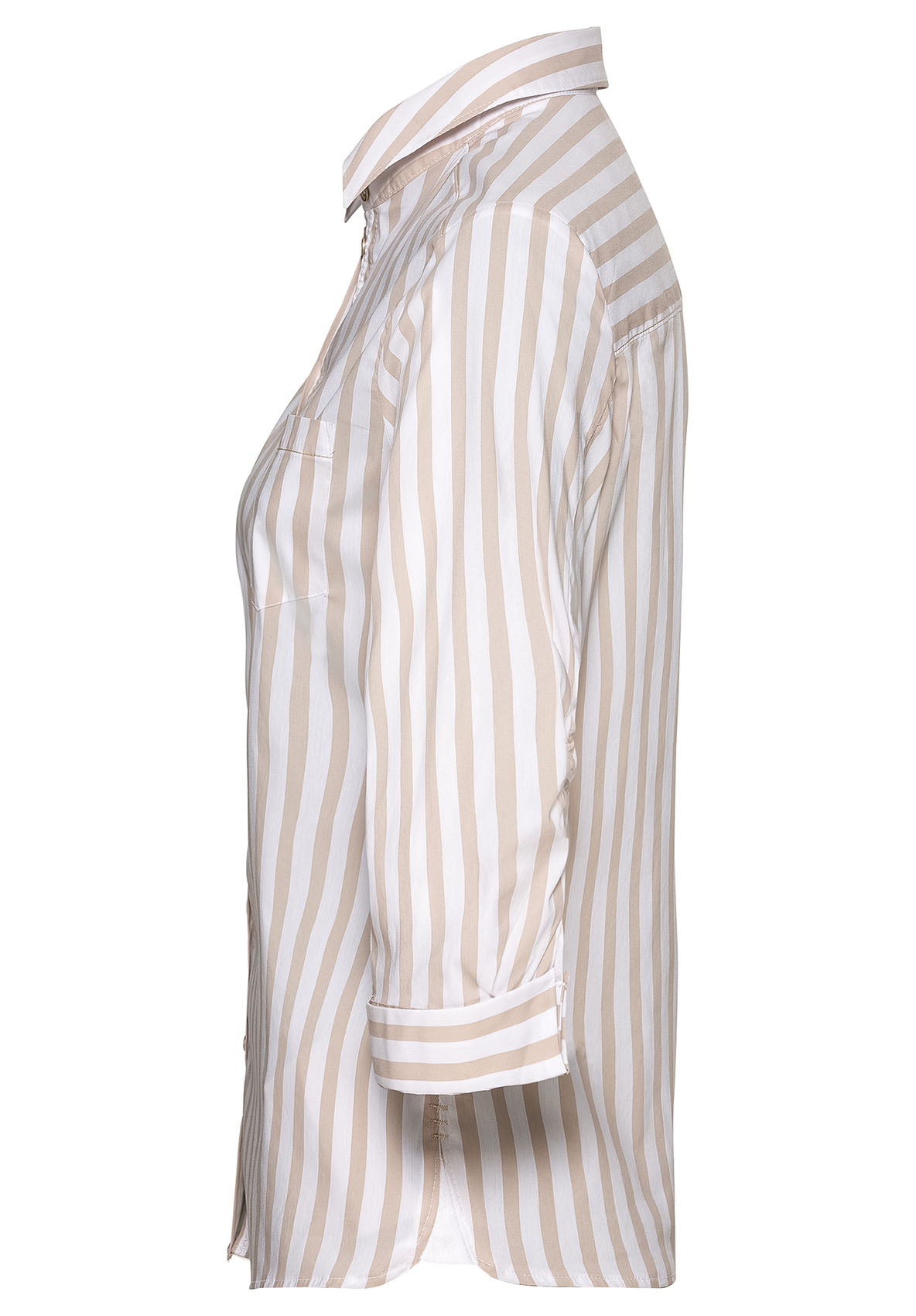 Модный фаворит - блузка Daira. С блузкой в белую и бежевую полоску вы создадите великолепный образ на каждый день. Модель состоит из приятной к телу хлопково-эластанной смеси. Заворачивающийся рукав 3/4, небольшой нагрудный карман и непрерывная пуговичная планка с матовыми золотистыми пуговицами еще больше подчеркивают вкус обладательницы. Рубашка-блузка отлично сочетается со всеми типами джинсов и благородно смотрится с брюками. • полосатая блузка • смесь хлопка, полиамида и эластана • рукава 3/4, которые можно закатать • непрерывная пуговичная планка • нагрудный карман спереди • слегка приталенный силуэт • длина около 65 см