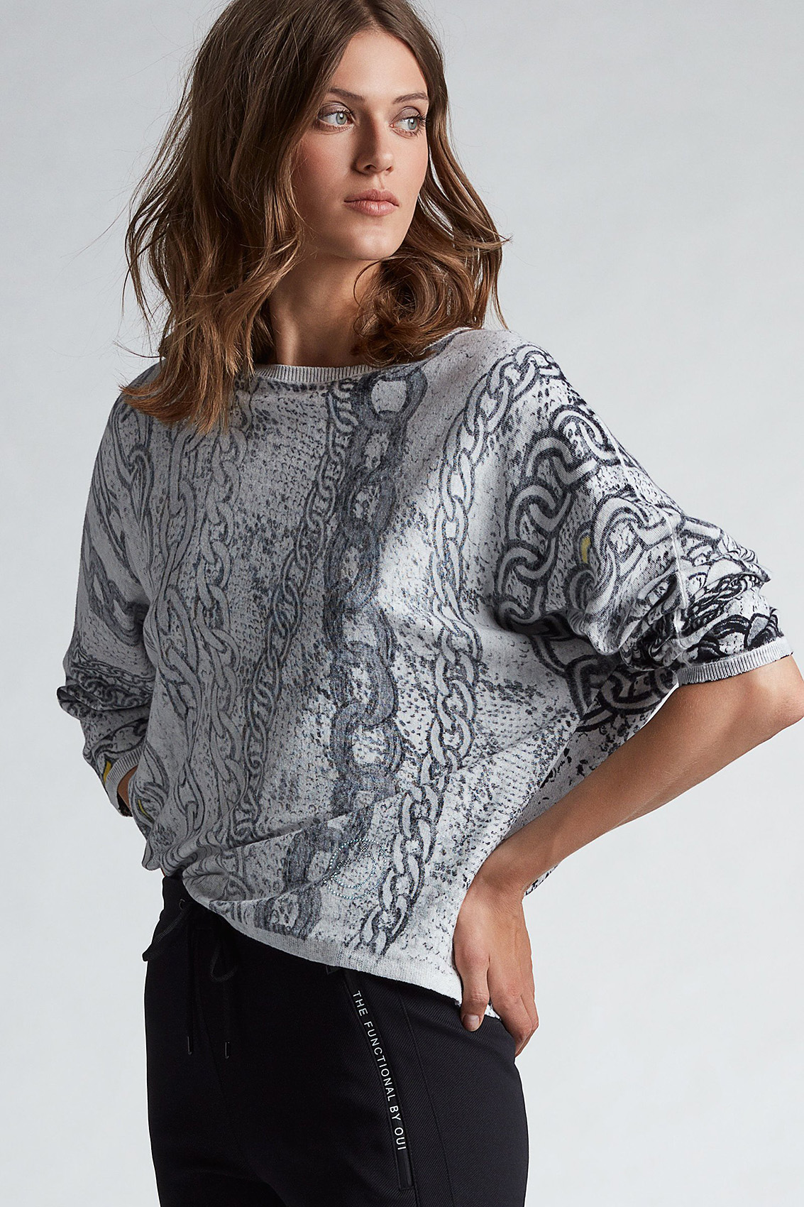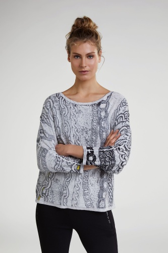Этот джемпер непременно обратит на себя внимание благодаря необычному принту. Джемпер прямого покроя, горловина-лодочка, длинные рукава. Хлопковый материал приятен к телу и обеспечивает комфорт. В сочетании с лаконичным низом джемпер создает стильный современный образ.