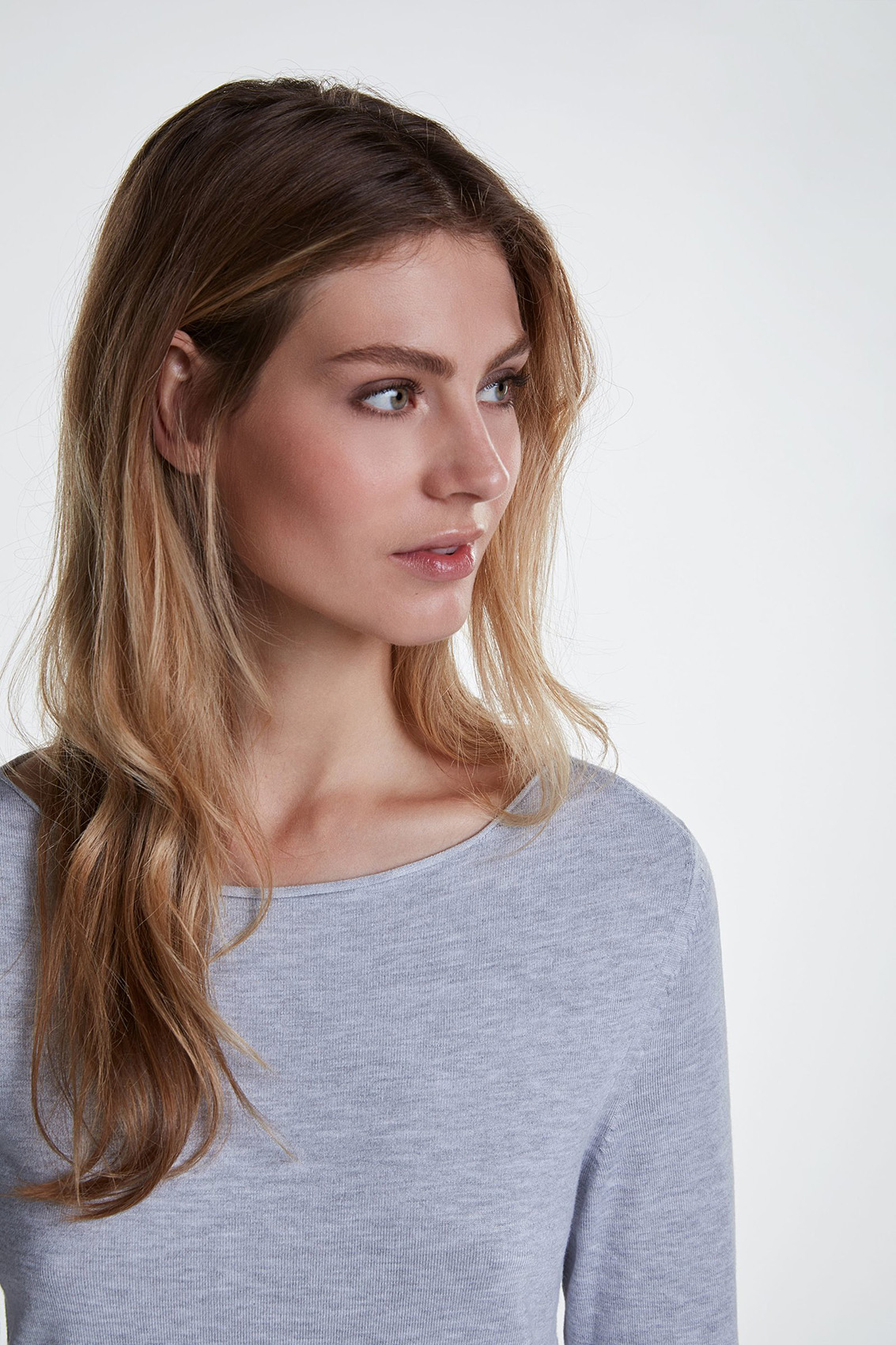Джемпер полуприлегающего силуэта - базовая модель. Вырез горловины "лодочка", рукава полной длины, фигурный низ изделия. Приятный к телу материал из вискозной смеси.