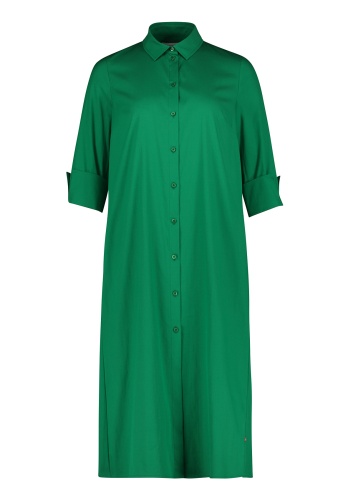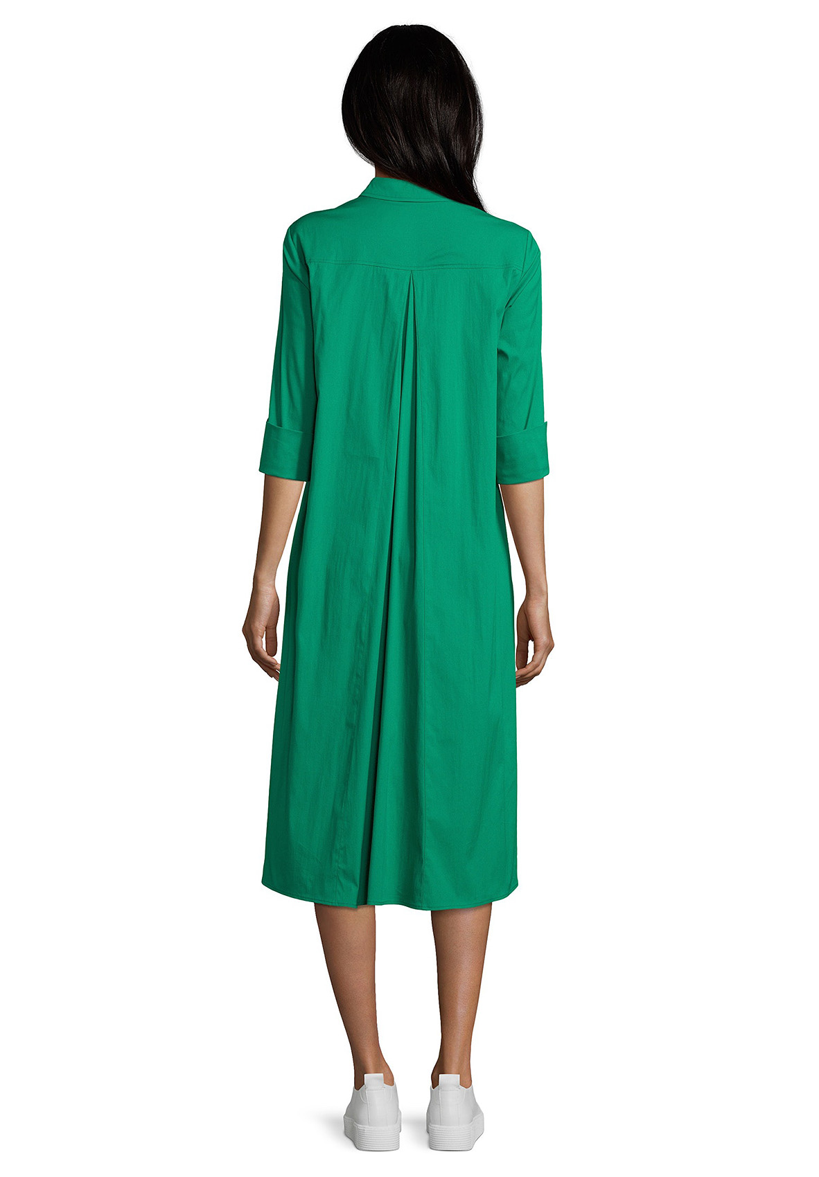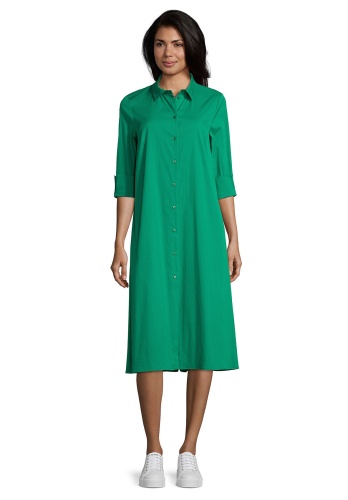Трендовая модель - платье-рубашка! Платье миди силуэта трапеция. Рубашечный вороник, застежка на пуговицы спереди, рукава 1/2 на манжетах, кокетка на спинке, декоративная складка. Приятный к телу материал из хлопковой смеси. Это платье обеспечивает создание стильного образа как с туфлями на каблуке, так и со спортивной обувью.