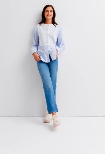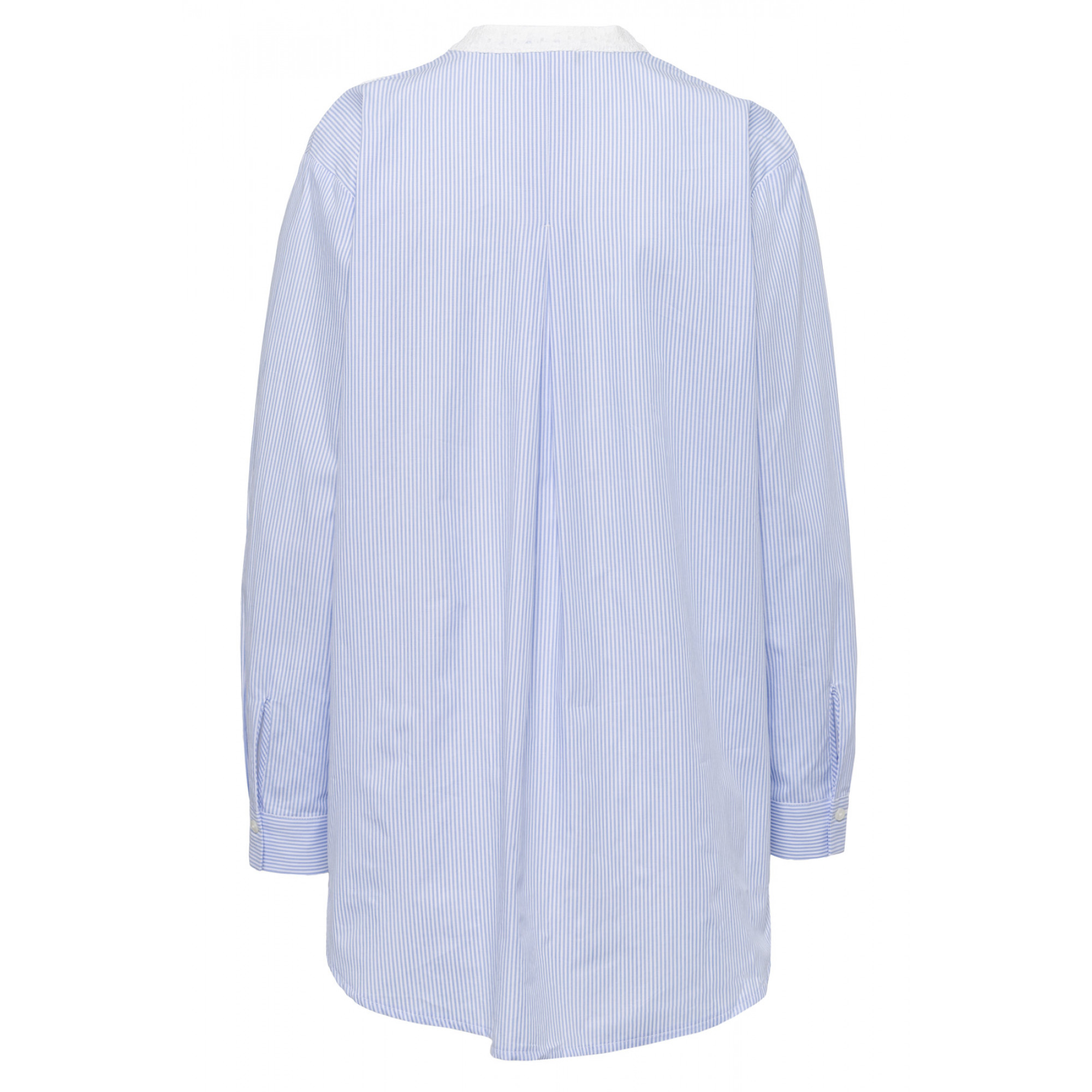 Бело-голубая блуза в полоску с небольшим воротником-стойкой и кружевной отделкой. Длинные рукава с манжетами на пуговицах. Низ модели скругленный, удлиненный сзади. Длина в размере 44 = 78см