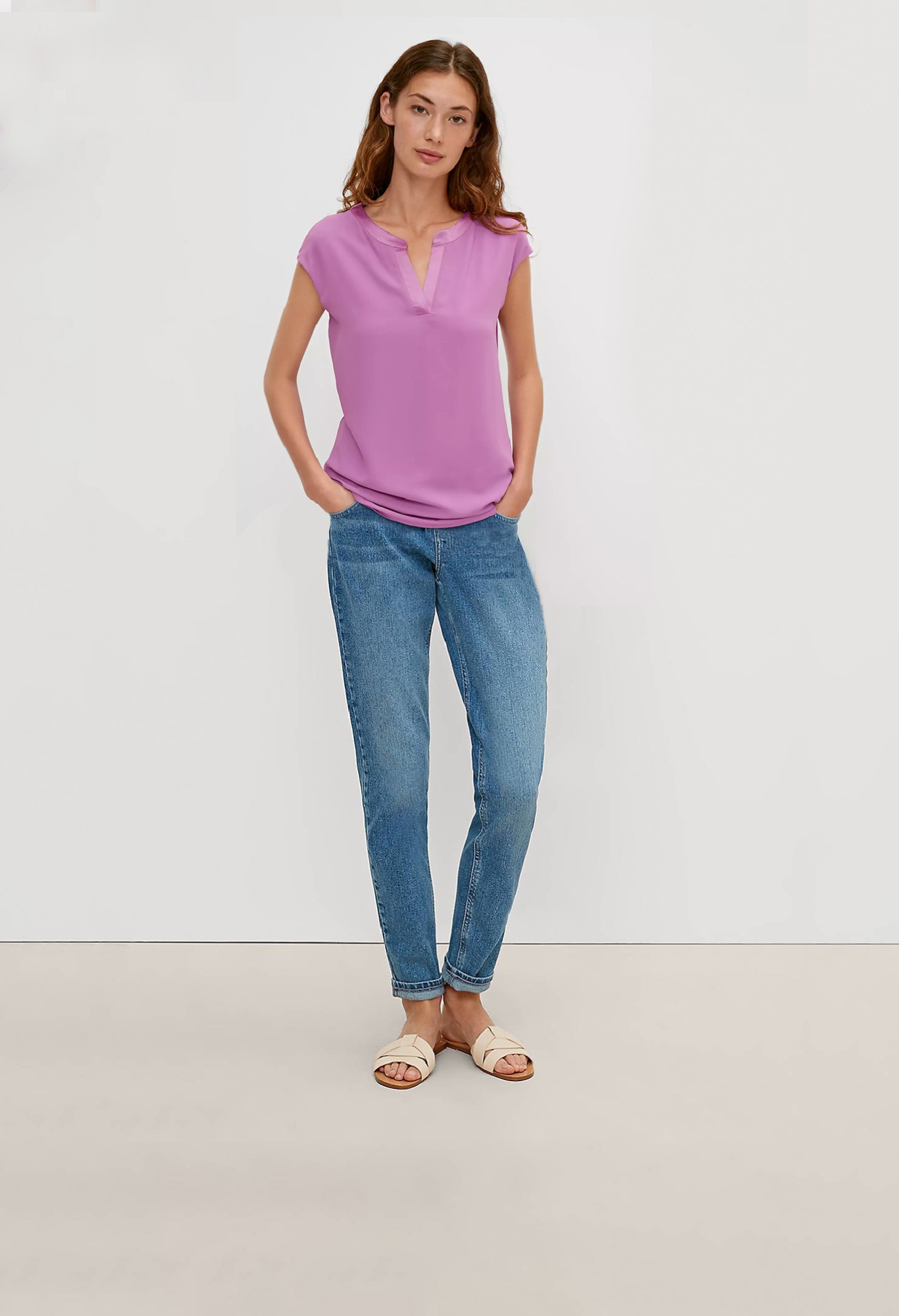 На сайте указаны российские размеры. Тонкая однотонная футболка из вискозы. Длина спины: 64 см в размере 42.