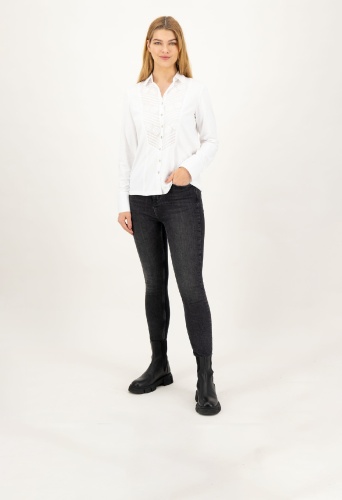 На сайте указаны российские размеры. Вышитая блузка из смесового хлопка с перламутровыми пуговицами. Модель ростом 177 см. Измерения для 44 размера: Окружность груди: 99 см Талия: 94 см Бедра: 106 см Длина по спинке: 62 см. Длина рукава: 62 см.