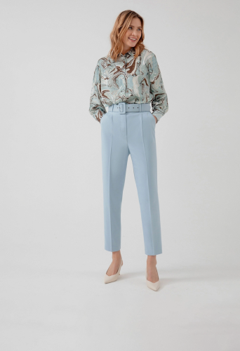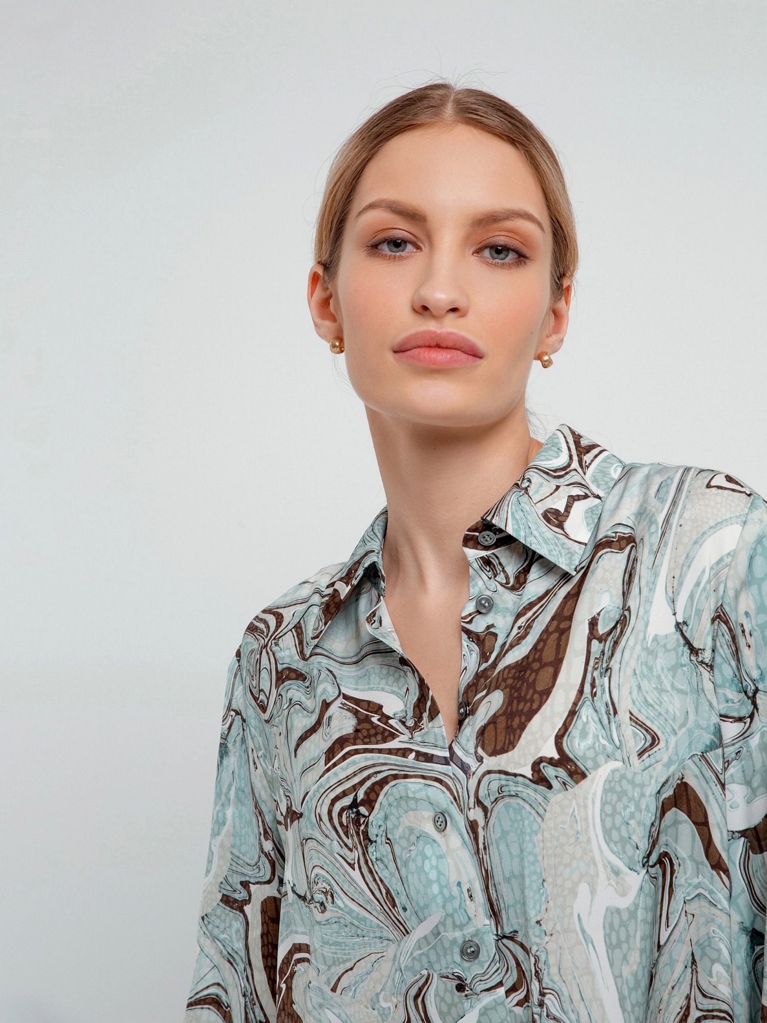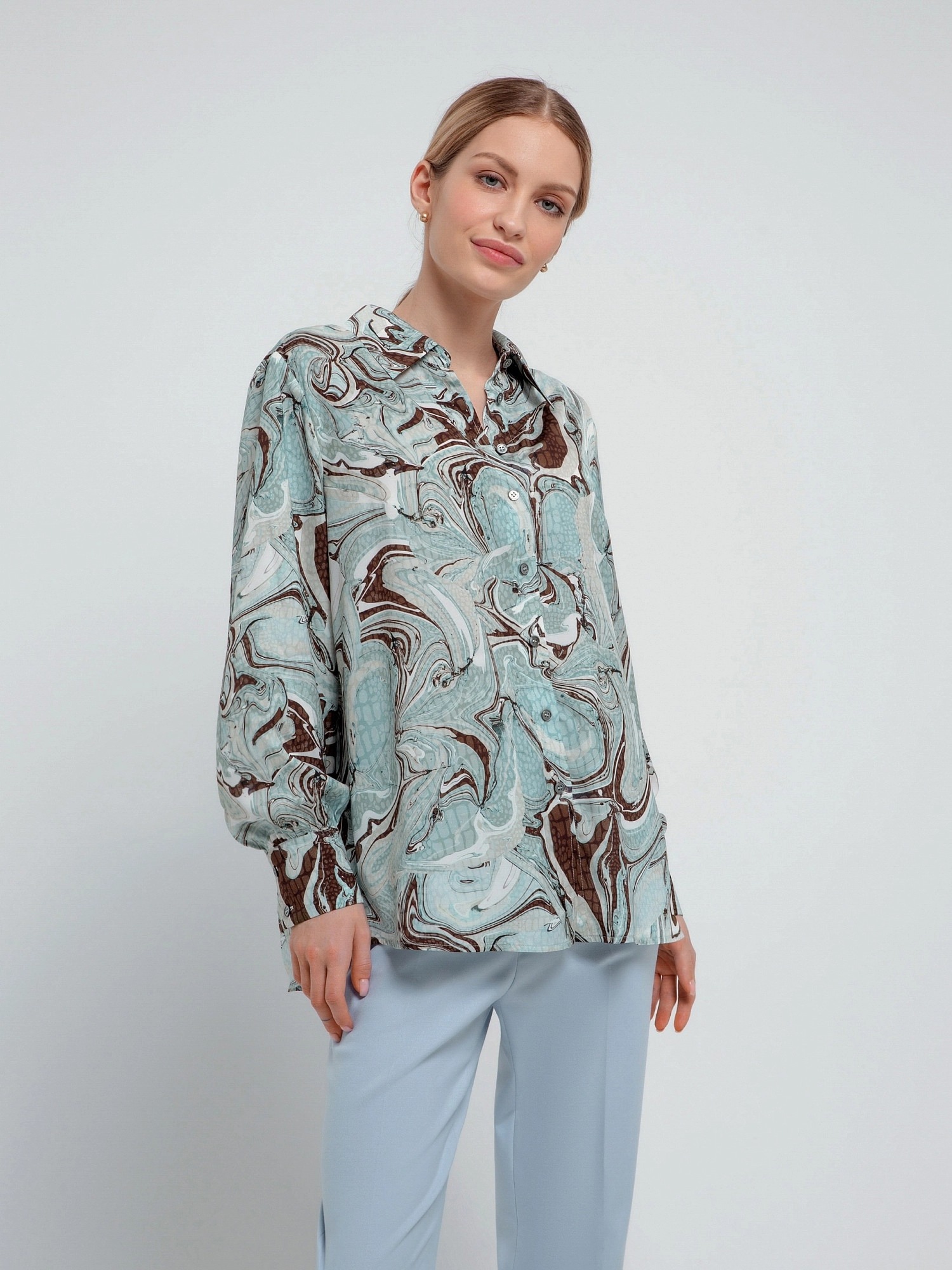 На сайте указаны российские размеры. Романтичная свободная классическая блуза из плательной ткани с абстрактным принтом. Идеальное дополнение для создания комплекта с юбкой из этой же ткани. Рост модели 175 см.