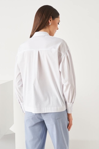 Блузка-рубашка свободного силуэта, отложной воротник-стойка, центральная застежка на пуговицы. Спущенная линия плеча, объемные рукава сосборены на высокие манжеты с разрезом и застежкой на пуговицы. В шов манжеты заложены складки, в боковых швах выполнены разрезы. Спинка с кокеткой. Спереди выполнен дизайнерский принт в тон «Флора».